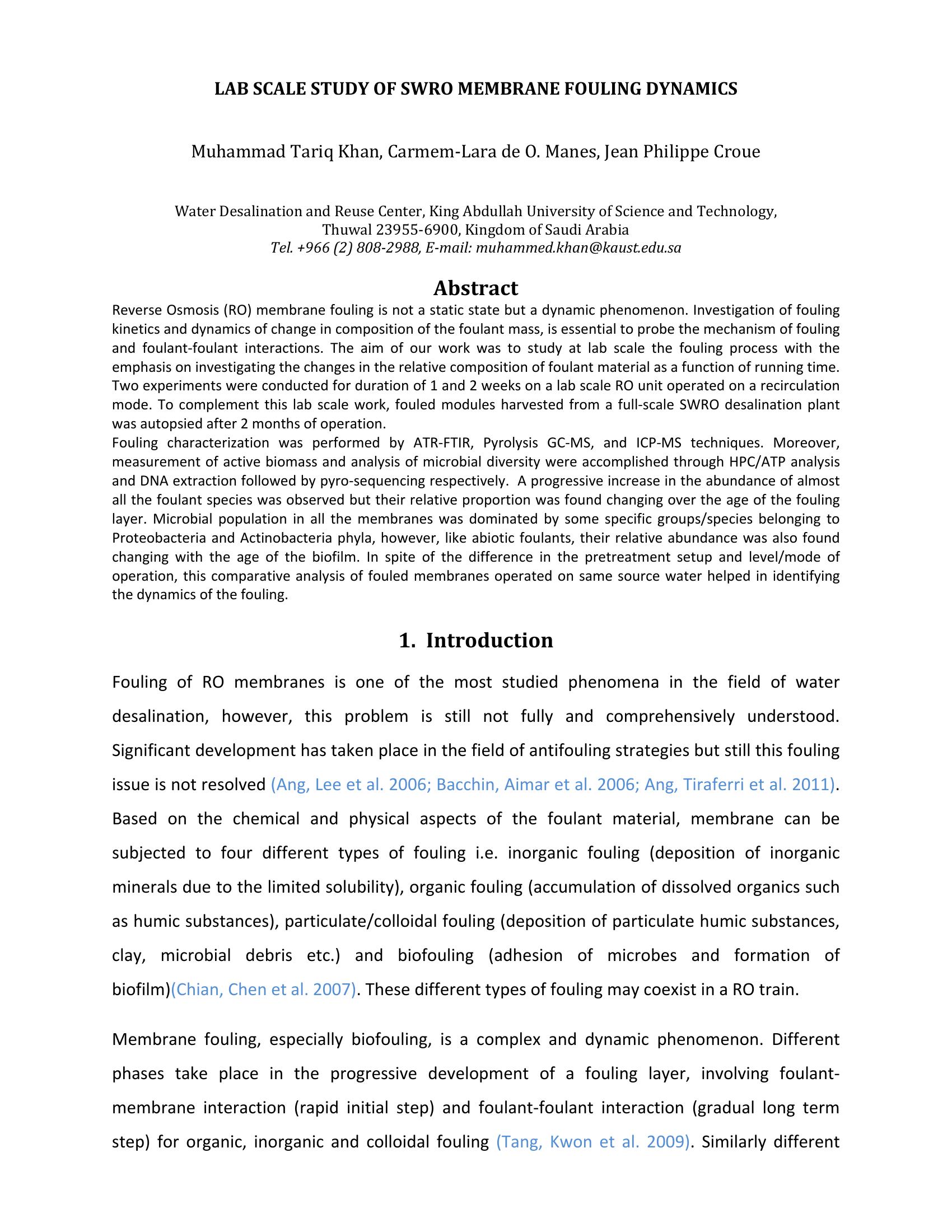 Fouling of RO membranes is examined one at lab scale with the emphasis on investigating the changes in the relative composition of foulant material as a function of running time for a given feed water quality. Fouling characterization was performed by ultra-structural, chemical and microbial analyses. This comparative analysis of fouled membranes helped to identifying the dynamics of fouling in this water source.