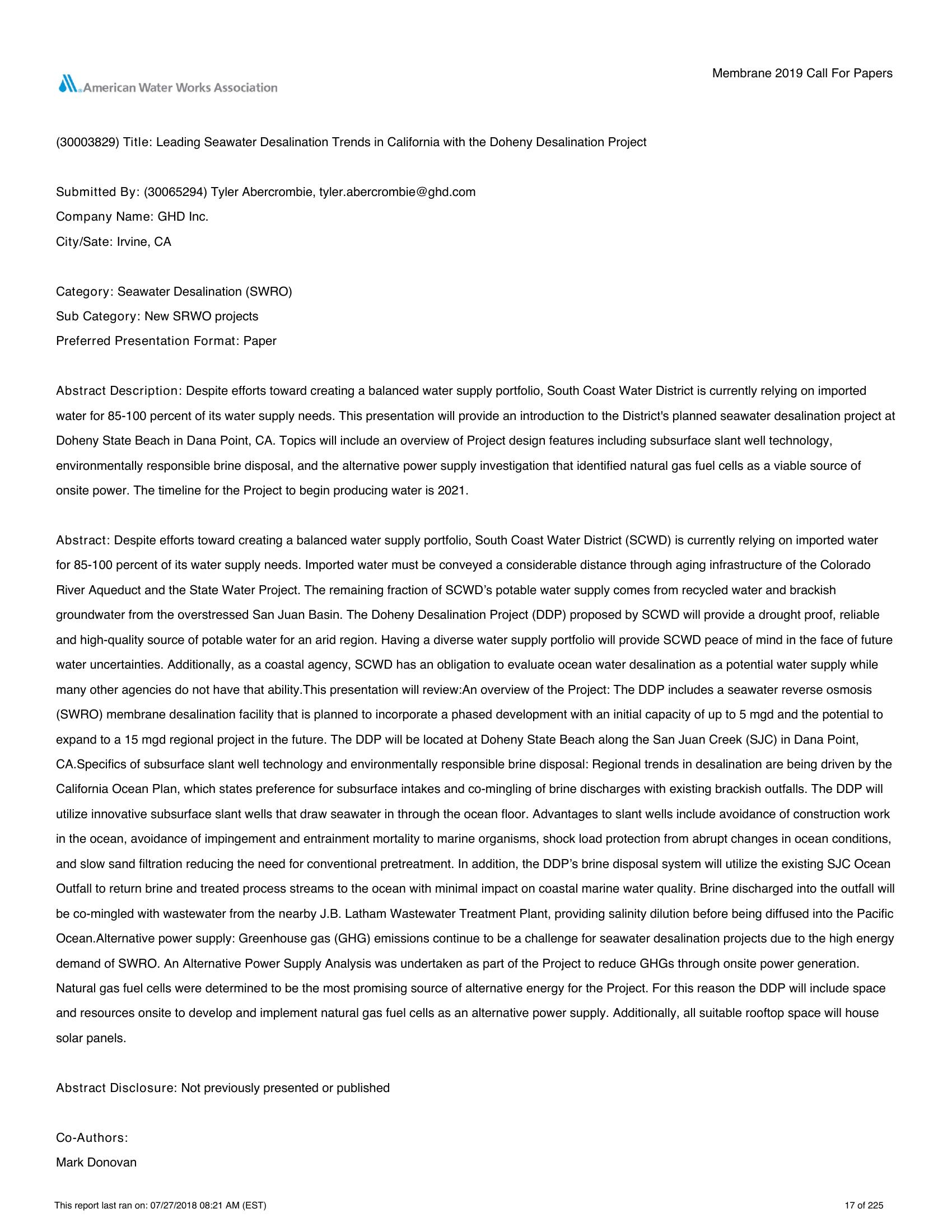Despite efforts toward creating a balanced water supply portfolio, South Coast Water District is currently relying on imported water for 85-100 percent of its water supply needs. This presentation will provide an introduction to the District’s planned seawater desalination project at Doheny State Beach in Dana Point, CA. Topics will include an overview of Project design features including subsurface slant well technology, environmentally responsible brine disposal, and the alternative power supply investigation that identified natural gas fuel cells as a viable source of onsite power. The timeline for the Project to begin producing water is 2021.