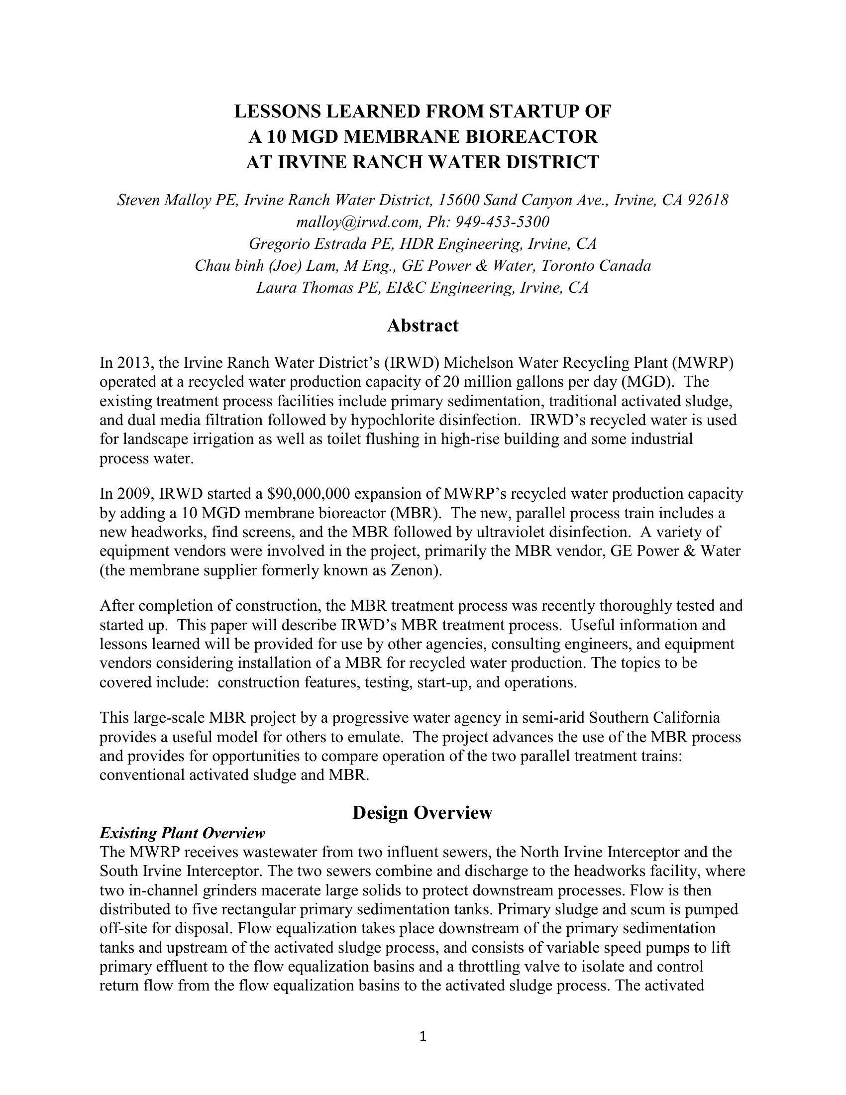 Lessons Learned from Start-up of the 10 MGD Membrane Bioreactor at Irvine Ranch Water District.