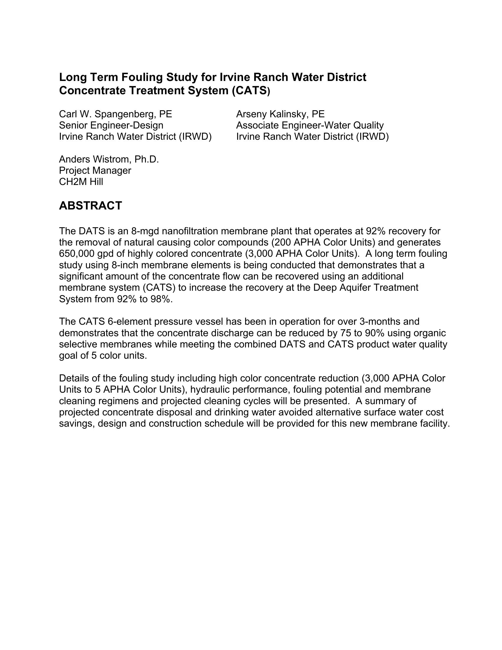 Long-Term Fouling Study for Irvine Ranch Water District Concentrate Treatment System