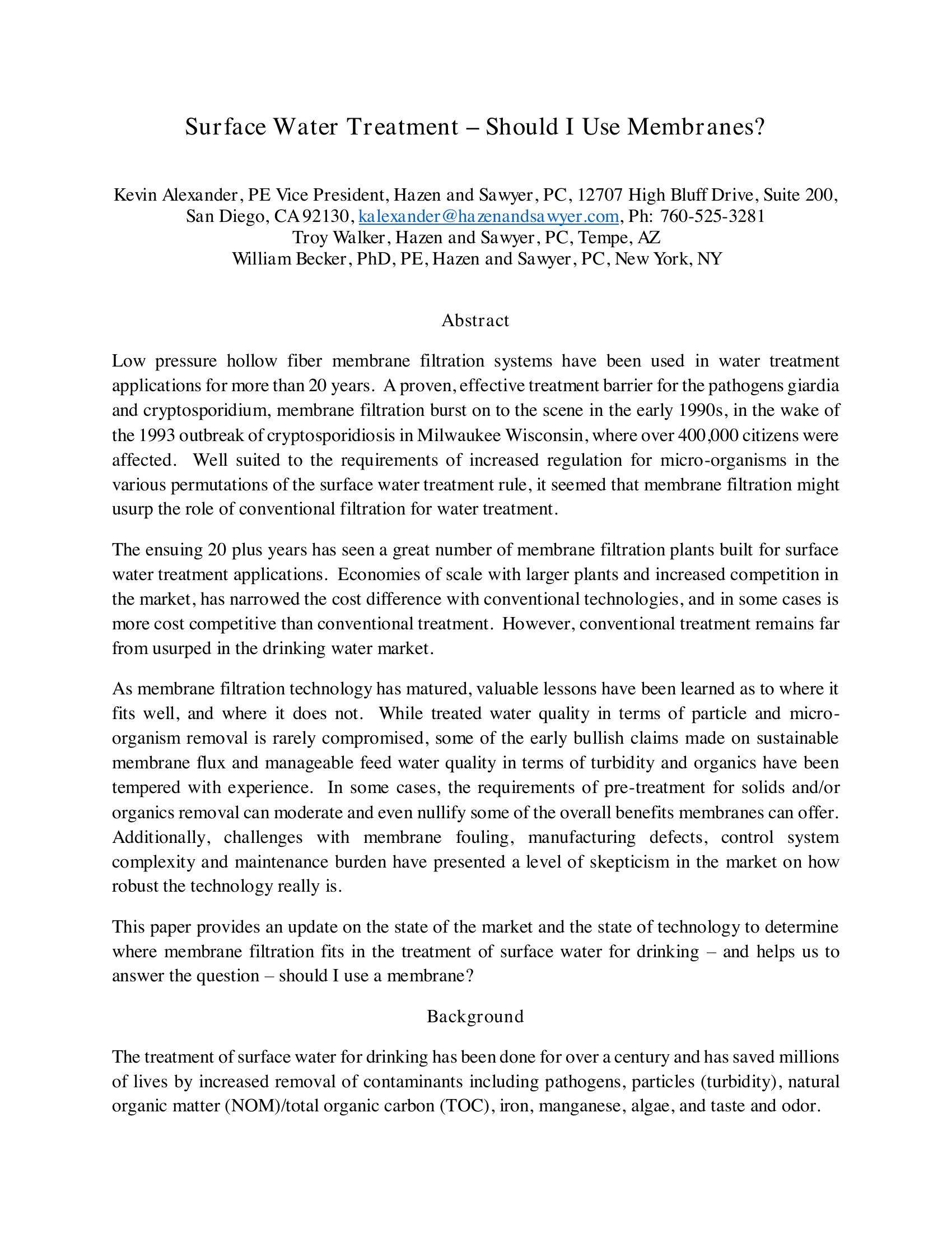 As membrane filtration technology has matured, valuable lessons have been learned as to where it fits and where it doesn’t. While treated water quality in terms of particle and microorganism removal is rarely compromised, some of the early claims made on sustainable membrane flux and manageable feed water quality in terms of turbidity and organics have been tempered with experience. Challenges with membrane fouling, manufacturing defects, control system complexity and maintenance burdens have presented a level of skepticism on how robust the technology really is. This paper provides an update on the state of the market and the technology to determine where membrane filtration fits in the treatment of surface water for potable use and helps answer the question of “should I use a membrane”?
