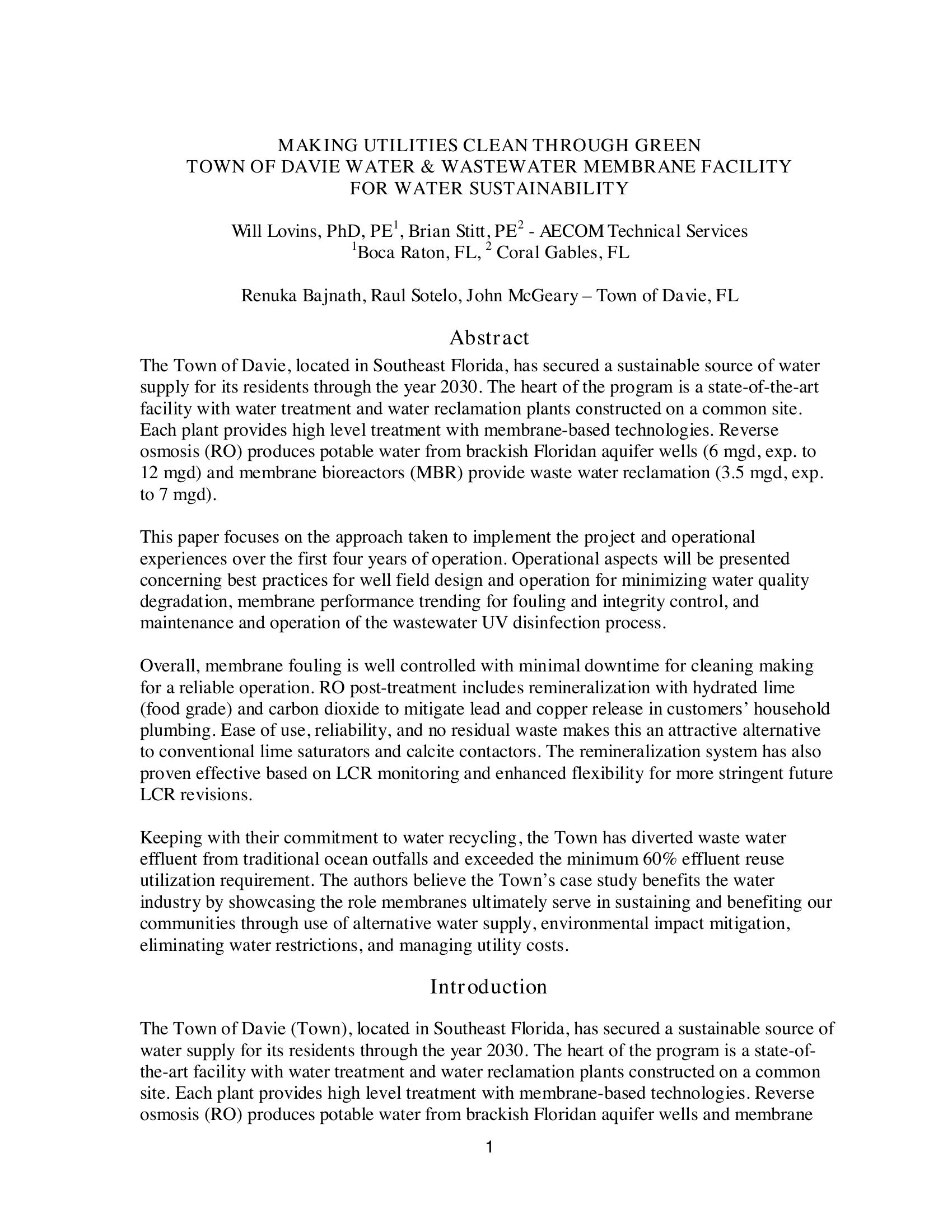 This paper reinforces the vital role membranes continue to play in the water industry by showcasing state-of-the-art RO water treatment (12 mgd) and MBR-UV (7 mgd) water reclamation processes at a common site. Highlights include public engagement and outreach for community support, master planning, alternative delivery with progressive design-build, features for making the facility a good neighbor, and operating history for this 108MM dollar facility. True to the paper?s title, the town?s facility shows how membranes ultimately sustain and benefit our communities by enabling sustainable water use, mitigating environmental impacts, avoiding harsh water restrictions, and being good stewards of public resources by managing utility costs.