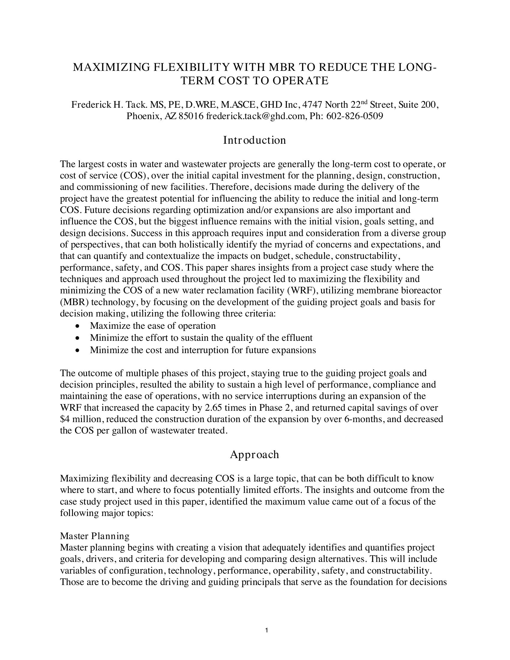 The largest costs in water and wastewater projects are generally the long-term cost to operate, or cost of service (COS), over the initial capital investment for the planning, design, construction, and commissioning of new facilities. Therefore, decisions made during the delivery of the project have the greatest potential for influencing the ability to reduce the initial and long-term COS. Future decisions regarding optimization and/or expansions are also important and influence the COS, but the biggest influence remains with the initial vision, goals setting, and design decisions. Success in this approach requires input and consideration from a diverse group of perspectives, that can both holistically identify the myriad of concerns and expectations, and that can quantify and contextualize the impacts on budget, schedule, constructability, performance, safety, and COS. This paper shares insights from a project case study where the techniques and approach used throughout the project led to maximizing the flexibility and minimizing the COS of a new water reclamation facility (WRF), utilizing membrane bioreactor (MBR) technology, by focusing on the development of the guiding project goals and basis for decision making, utilizing the following three criteria: ï Maximize the ease of operation ï Minimize the effort to sustain the quality of the effluent ï Minimize the cost and interruption for future expansions The outcome of multiple phases of this project, staying true to the guiding project goals and decision principles, resulted the ability to sustain a high level of performance, compliance and maintaining the ease of operations, with no service interruptions during an expansion of the WRF that increased the capacity by 2.65 times in Phase 2, and returned capital savings of over $4 million, reduced the construction duration of the expansion by over 6 months, and decreased the COS per gallon of wastewater treated.