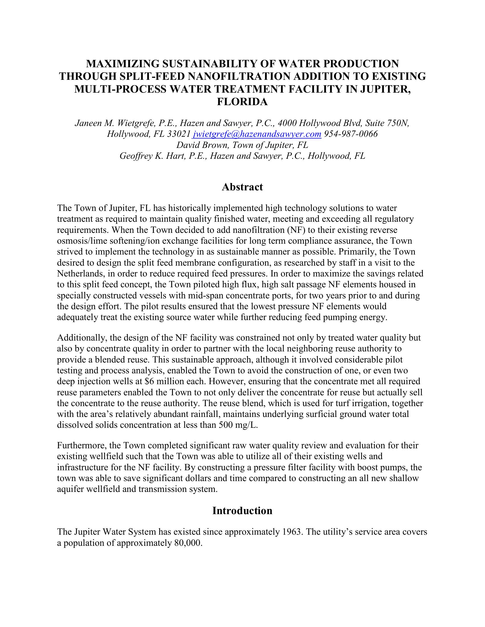 Maximizing Sustainability of Water Production through Split-Feed Nanofiltration Addition to Existing Multi Process Water Treatment Facility in Jupiter, Florida