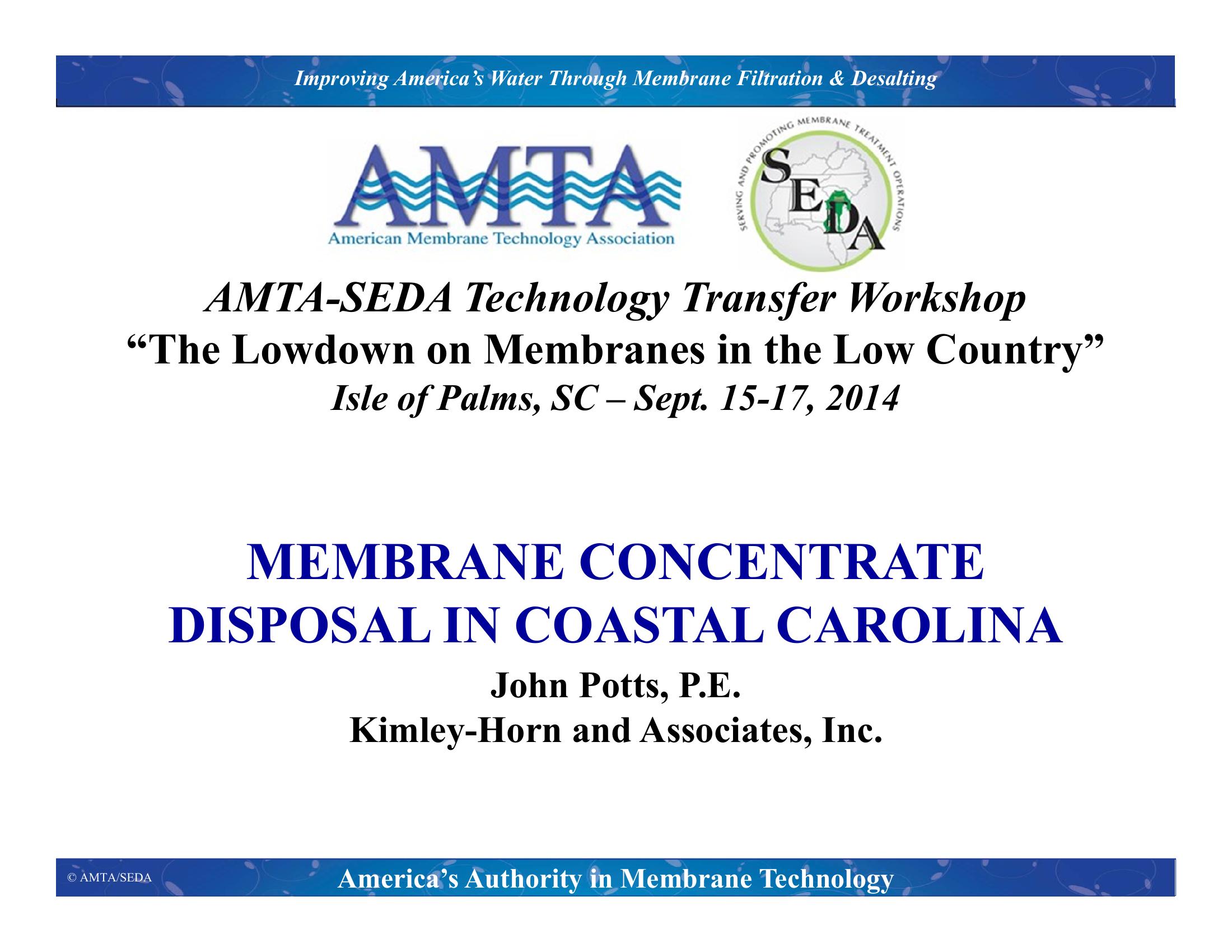 This presenation includes an overview of concentrate disposal alternatives for reverse osmosis in a coastal area. The discussion includes a description of concentrate characteristics, reuse opportunities and challenges, and disposal alternatives.