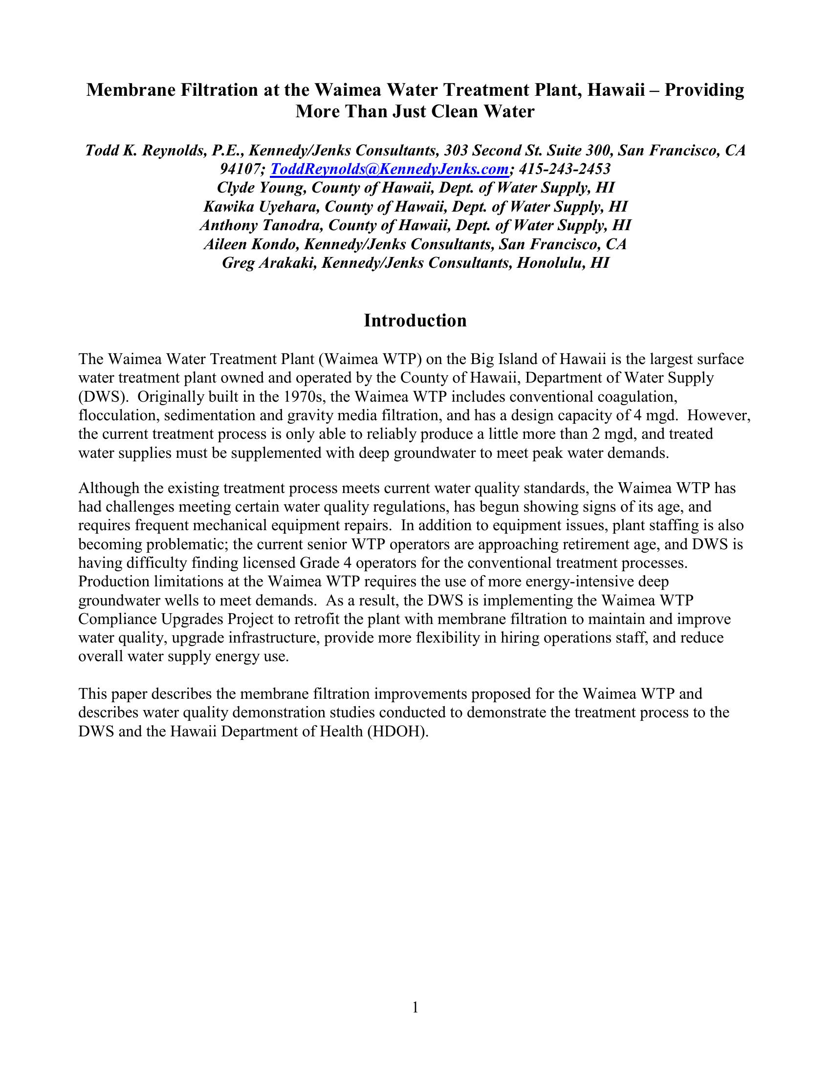 To address the issues of an aging WTP and licensure requirements, the Wiamea WTP began a project to upgrade its plant with membrane filtration to reliably produce 4 MGD. A demonstration study occurred to confirm produced water quality and introduce operators to membrane filtration processes. With only 2.0-log Giardia removal credit given, there have been several discussions with regulators to adjust it, but if no headway if made the disinfection system must be upgraded as well. This will only add to the paramount concern over capital costs associated with building a plant.