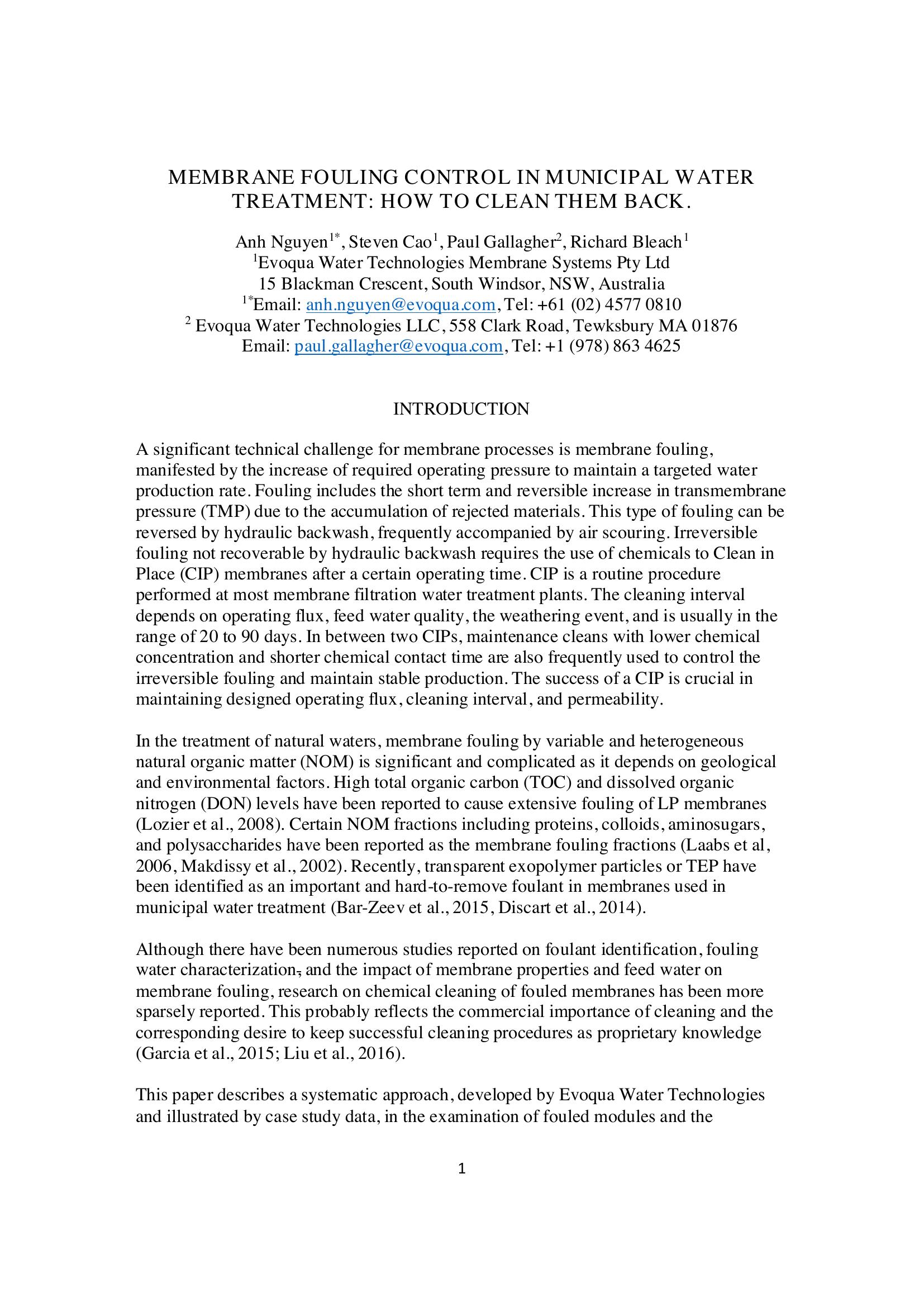 Membrane Fouling Control in Municipal Water Treatment: How to Clean Them Back.