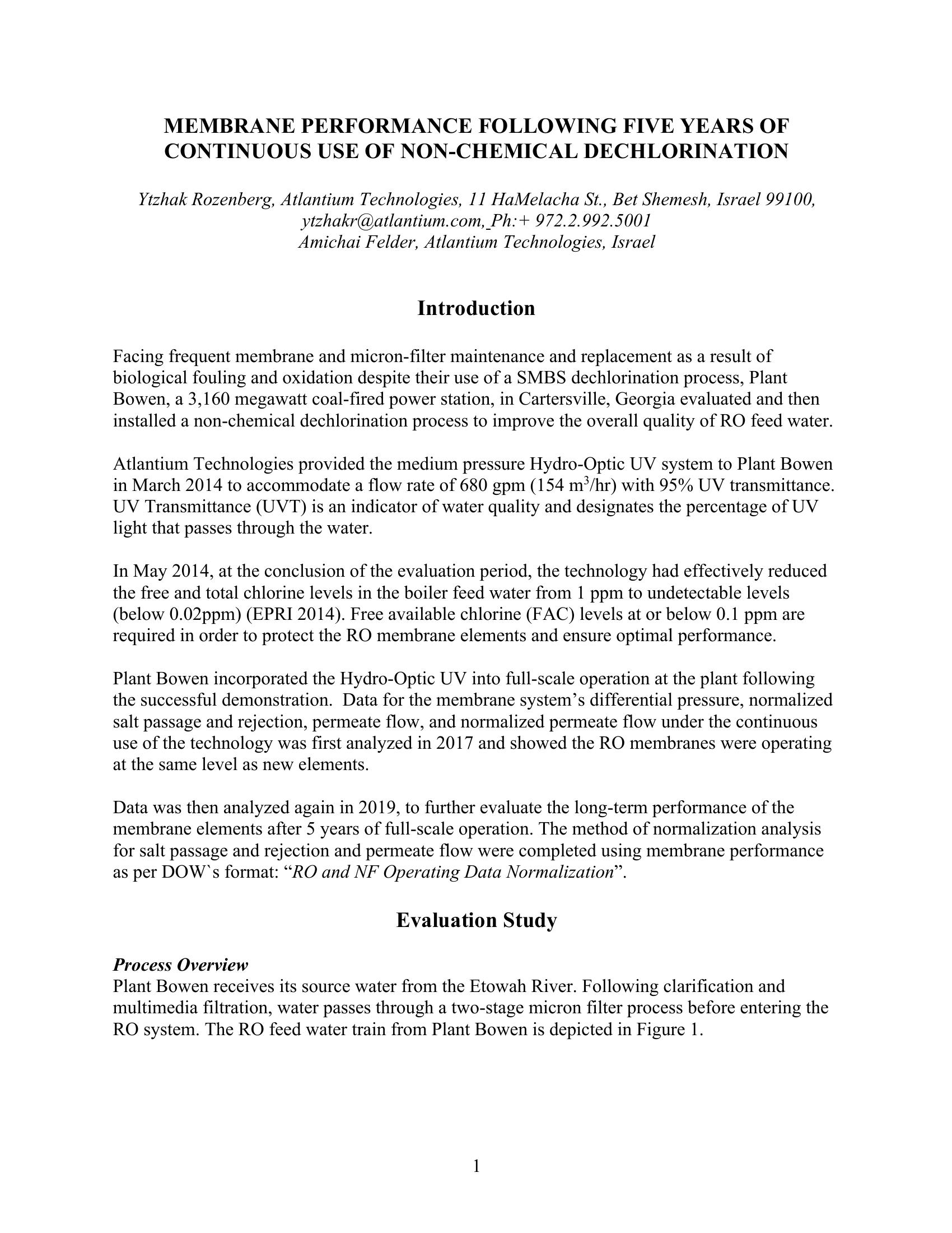 Facing frequent membrane and micron-filter maintenance and replacement as a result of biological fouling and oxidation despite their use of a SMBS dechlorination process, Plant Bowen, a 3,160 megawatt coal-fired power station, in Cartersville, Georgia evaluated and then installed a non-chemical dechlorination process to improve the overall quality of RO feed water. Atlantium Technologies provided the medium pressure Hydro-Optic UV system to Plant Bowen in March 2014 to accommodate a flow rate of 680 gpm (154 m3/hr) with 95% UV transmittance. UV Transmittance (UVT) is an indicator of water quality and designates the percentage of UV light that passes through the water.