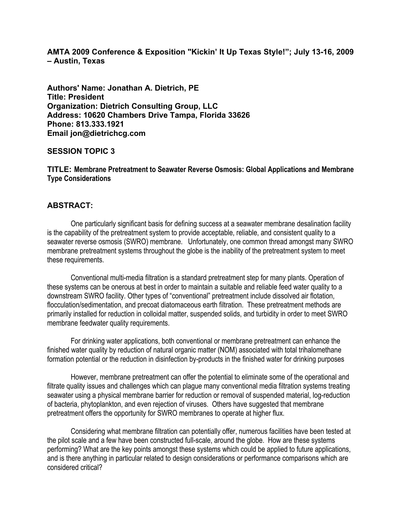 | Keywords | reverse osmosis (RO) membrane separation, membrane pretreatment, membrane filtration technologies |