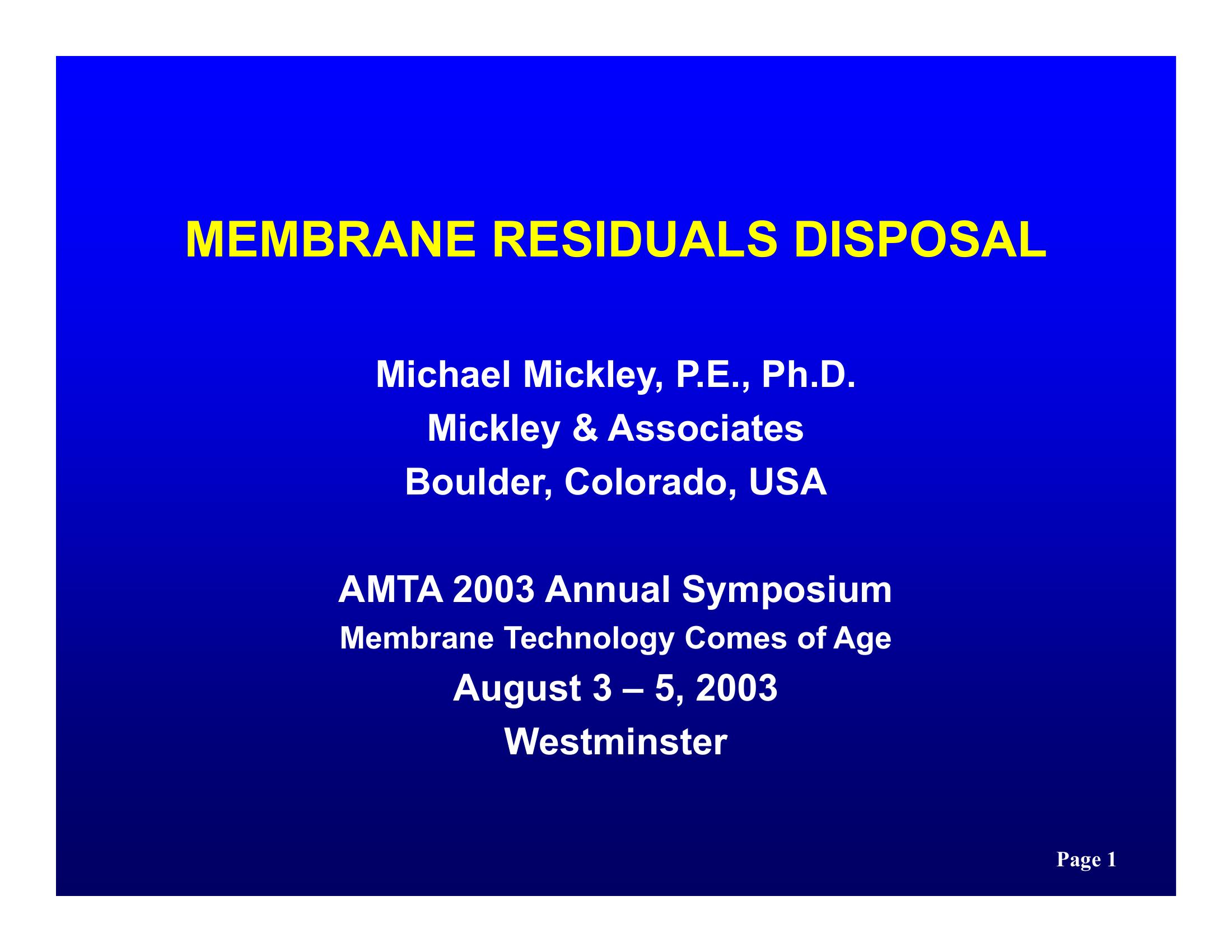 Presentation of a data gathering effort to compile information on all membrane water treatment facilities in the the United States with emphasis on establishment of the treatment residual process utilized at each facility.