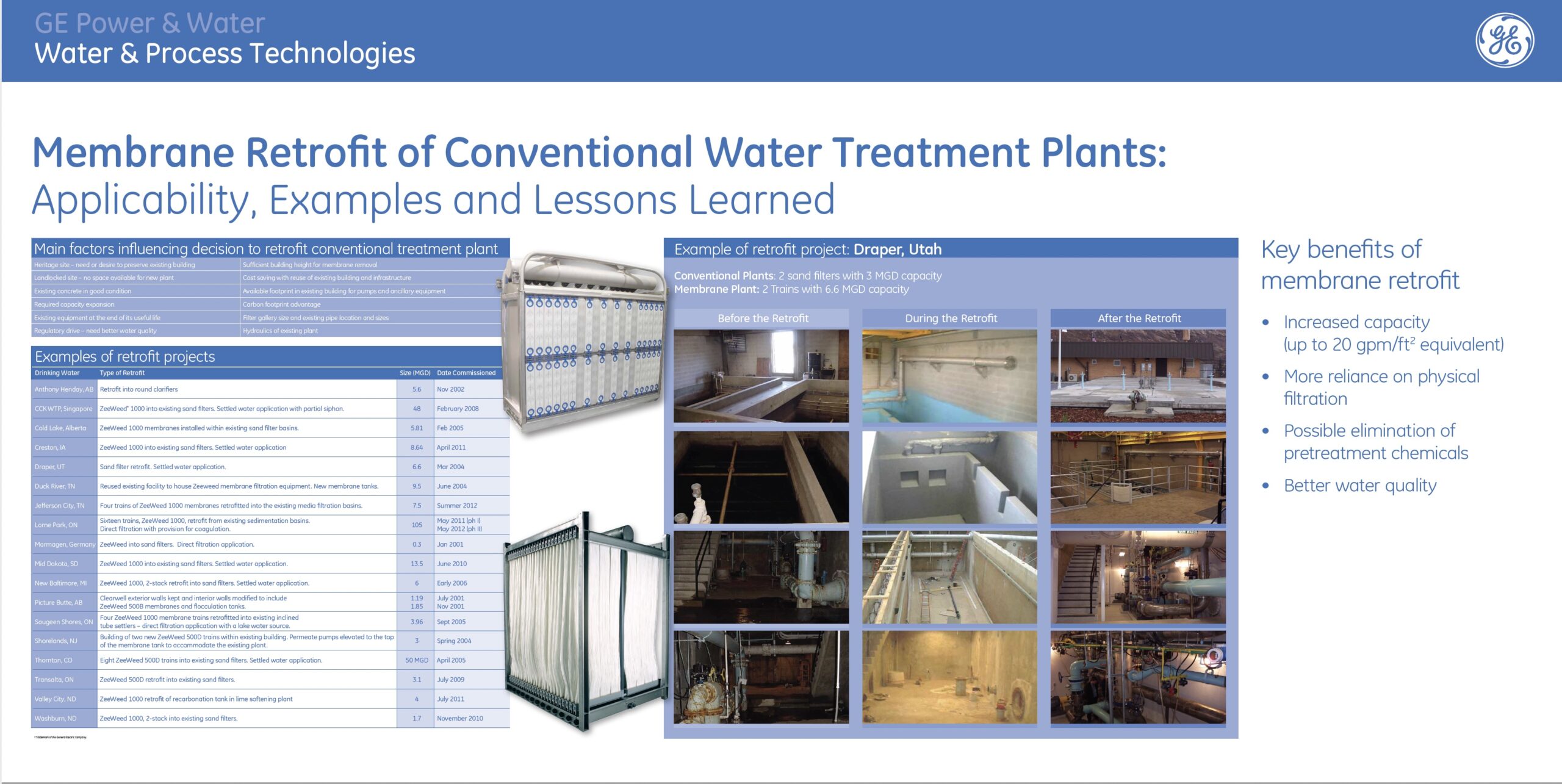The use of membrane systems in municipal applications can be divided between new green field plants and retrofit of existing conventional filtration facilities. Both types of construction have their benefits and drawbacks depending on the application, site conditions and age of the existing infrastructure. Using a retrofit approach can be very beneficial by reducing the cost and shortening the schedule when conditions are right. It should therefore be considered before automatically choosing to build a new plant when existing infrastructures exist.