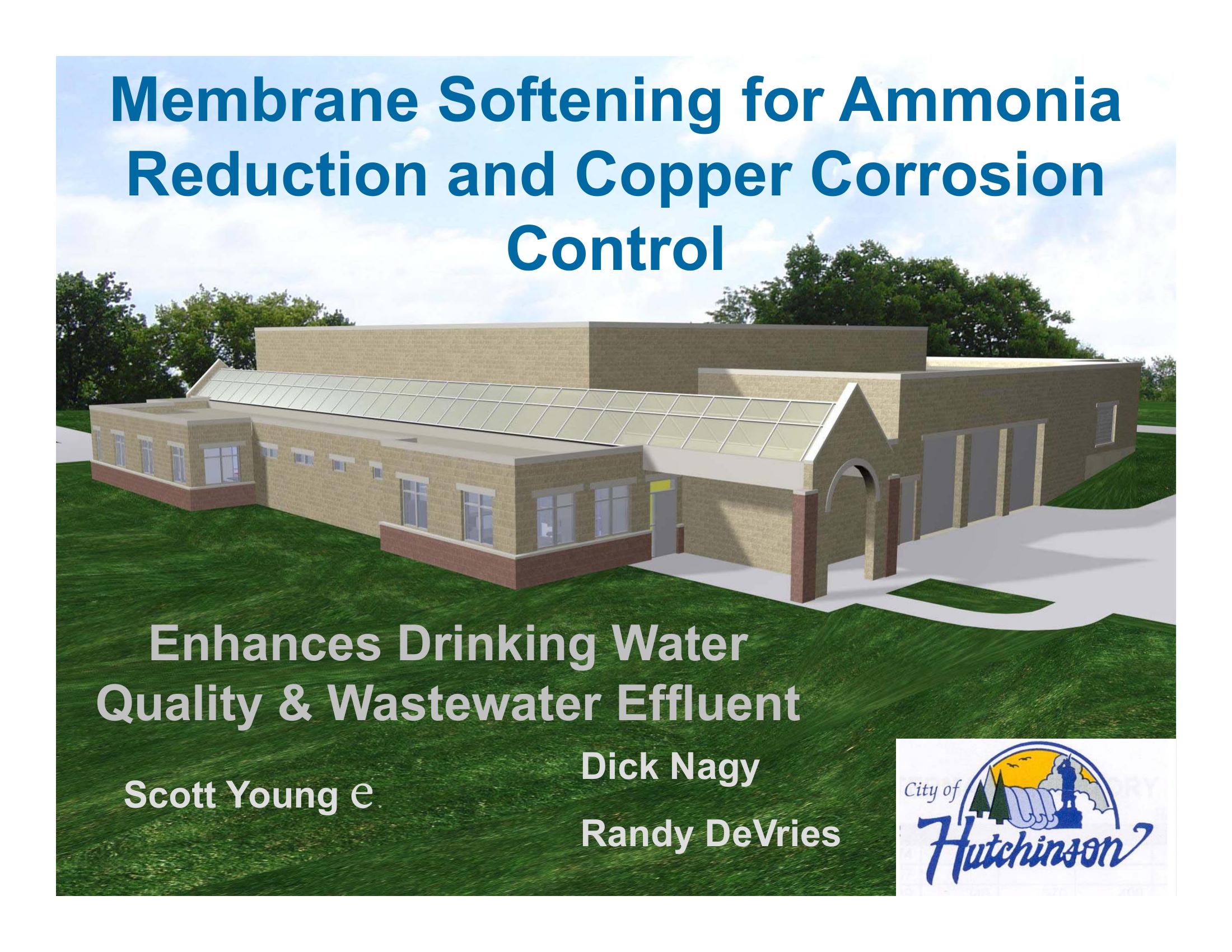 This presentation covers the use of nanofiltration (membrane softening) to reduce ammonia and copper corrosion. The focus starts with design goals and then covers water quality issues, wastewater quality and the existing water treatment system. From there the presentation moves to discuss pilot test objectives and results and then the preliminary design of a new nanofiltration facility.