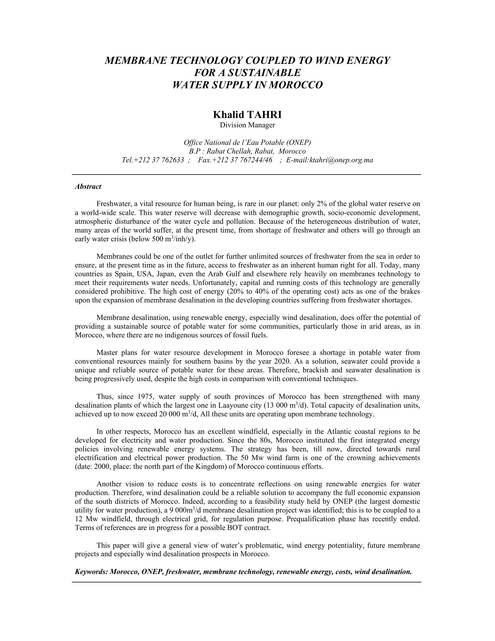 This paper will give a general view of water’s problematic, wind energy potentiality, future membrane projects and especially wind desalination prospects in Morocco.