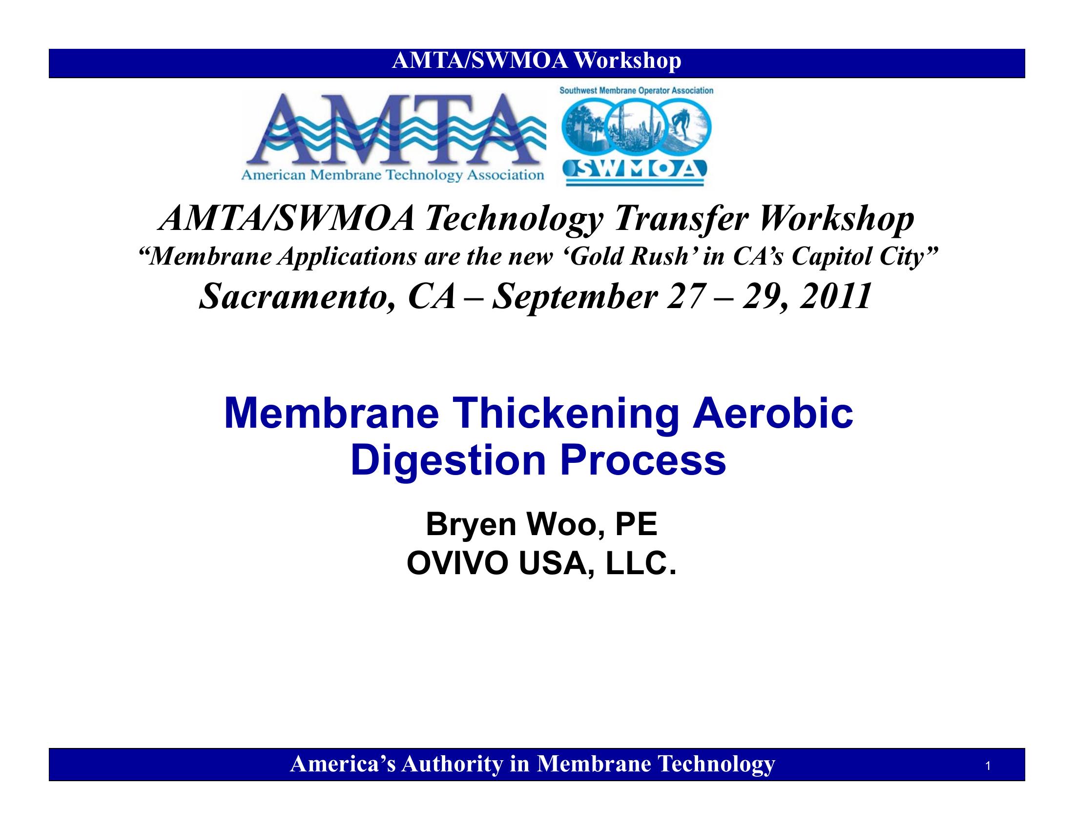 This presentation provides an overview of membranes used for thickening in aerobic digestion process. The benefits include: superior thickening without use of polymers; require very minimal operator attention; permeate can be sent to disinfection or to the head of the plant; and result in savings on hauling, operating, and energy costs.