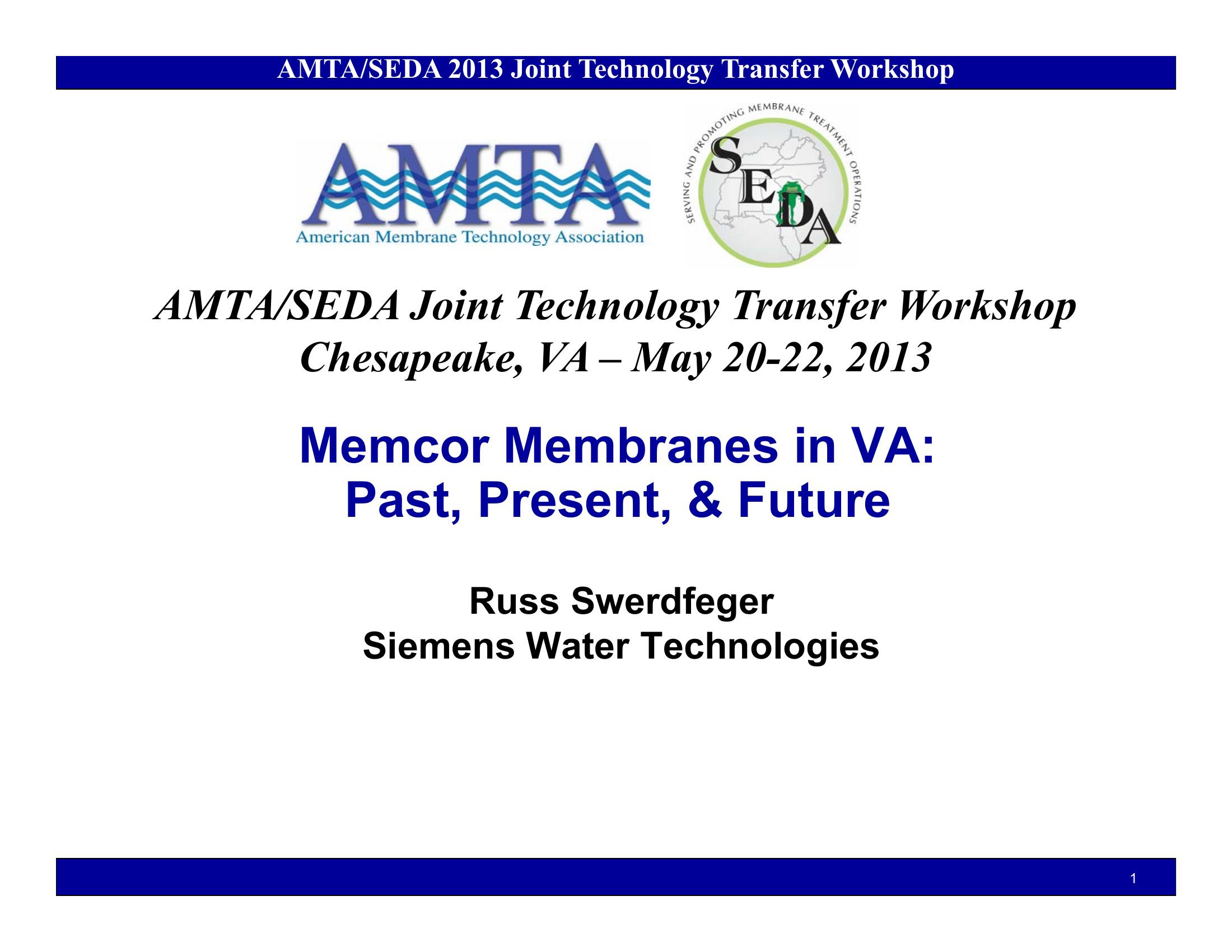 This PowerPoint presentation discusses the Siemens Memcor membrane installations in Virginia : Past, Present, & Future