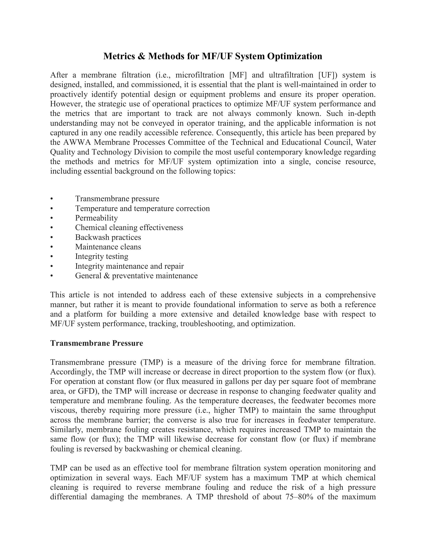 This paper covers a wide variety of the current knowledge base about how to best operate and maintain a membrane filtration facility. Its authors cover the range of professionals with knowledge on the subject including design engineers, suppliers, regulators, and academics.