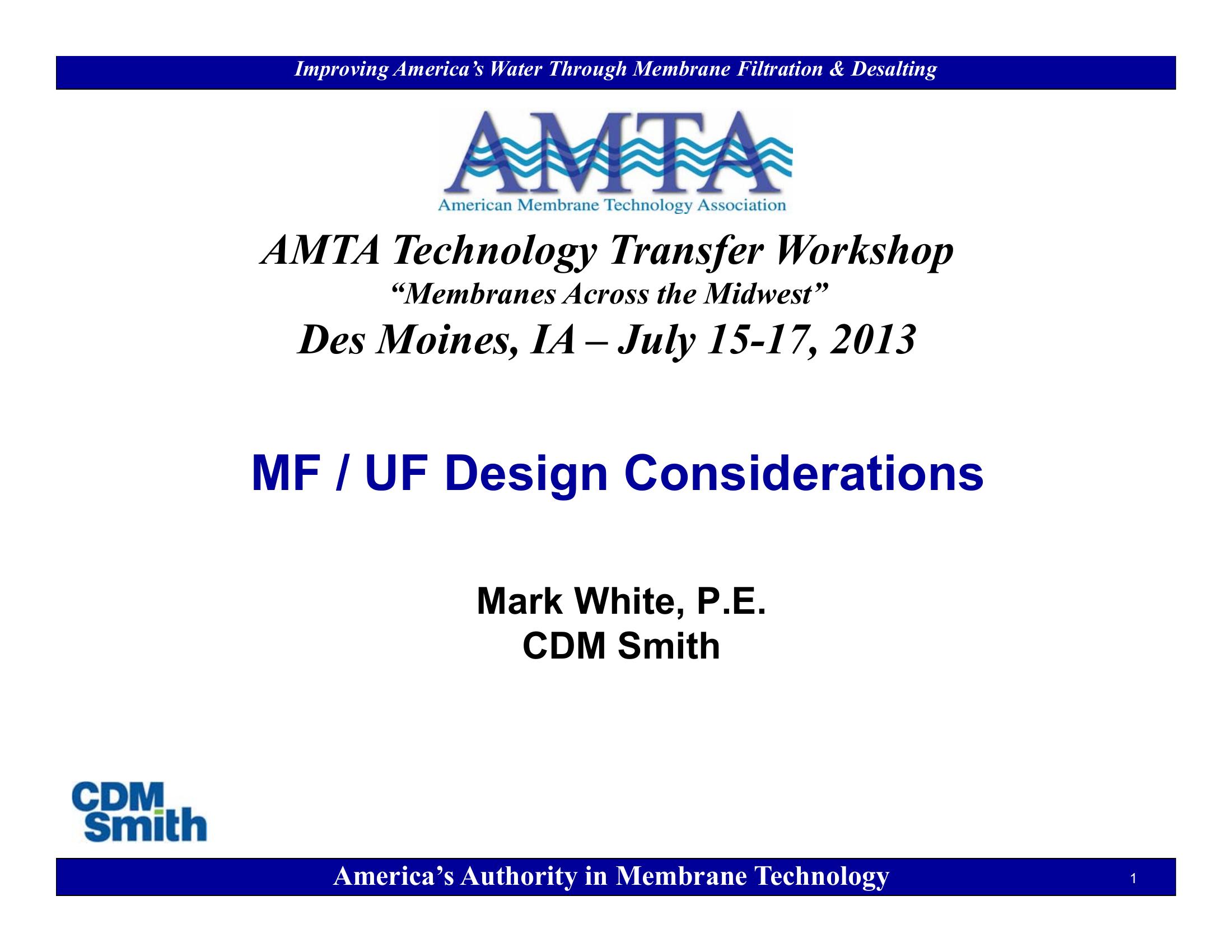 This presentation discusses microfiltration (MF) and ultrafiltration (UF) membrane types, design parameters, raw water quality impacts, facility layout design, and system component design. The presentation begins with general terms and then transitions to design tips for pressure and submerged systems inclusive of equipment layout, pumps, piping, and valves. Startup requirements and residuals management are also explored.