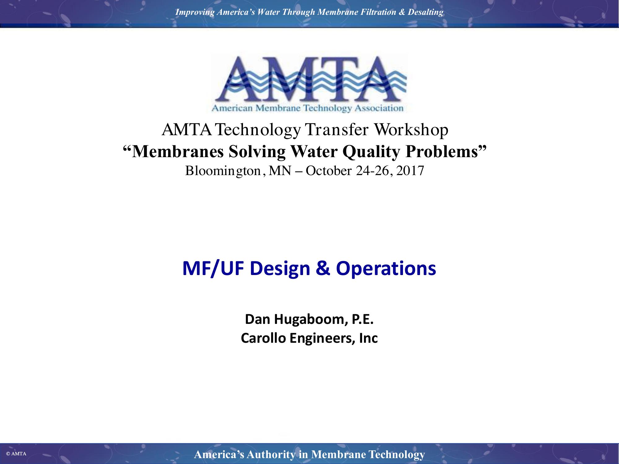 The presentations will highlight key design concepts for MF/UF systems as well as considerations for intergating MF/UF systems into a water treatmentprocess train. The presentation will introduce the audience to flux selection, rack sizing, flow control concepts, CIP system design, and residuals handling considerations.
