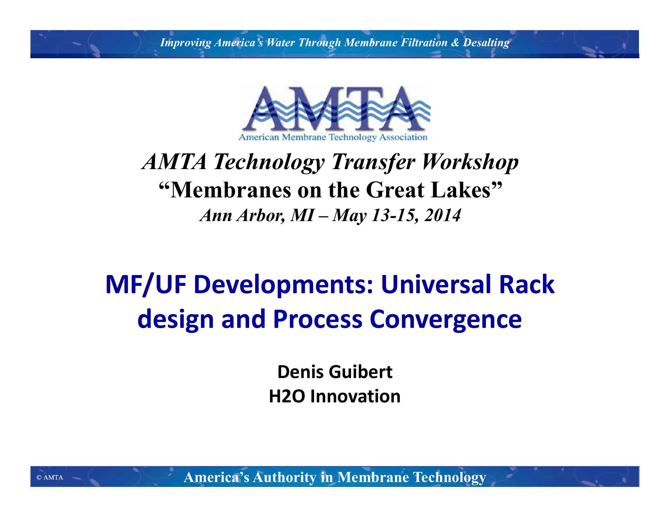 This presentation discusses the evolution of the microfiltration (MF) and ultrafiltration (UF) membrane market, standardization in membrane module design and process operations, and the universal rack concept. MF and UF manufacturers are listed and module interchangeability between manufacturers is discussed. The presentation concludes with a summary of advantages for standardization and predictions for the future.