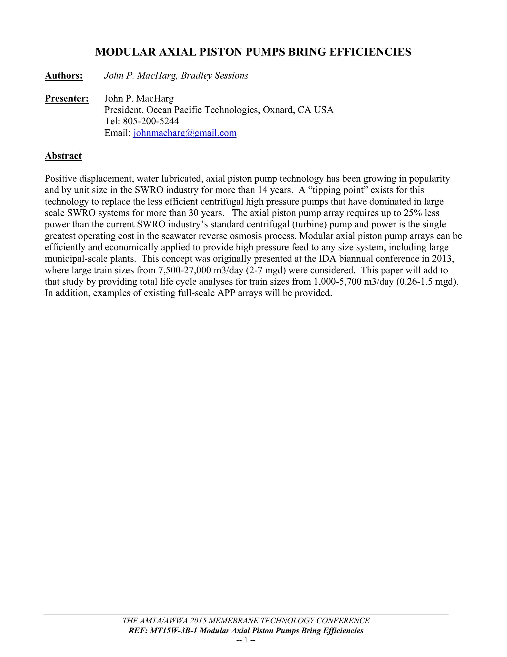 Life cycle cost analysis and application review of water lubricated Axiel Piston (AP) positive displacement pumps vs. centrifugal (turbine) pumps with energy recovery devise (EDR) in SWRO systems.