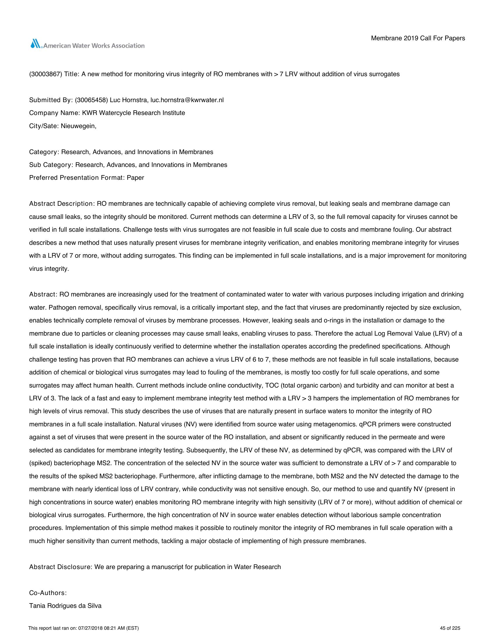RO membranes are technically capable of achieving complete virus removal, but leaking seals and membrane damage can cause small leaks, so the integrity should be monitored. Current methods can determine a LRV of 3, so the full removal capacity for viruses cannot be verified in full scale installations. Challenge tests with virus surrogates are not feasible in full scale due to costs and membrane fouling. Our abstract describes a new method that uses naturally present viruses for membrane integrity verification, and enables monitoring membrane integrity for viruses with a LRV of 7 or more, without adding surrogates. This finding can be implemented in full scale installations, and is a major improvement for monitoring virus integrity.