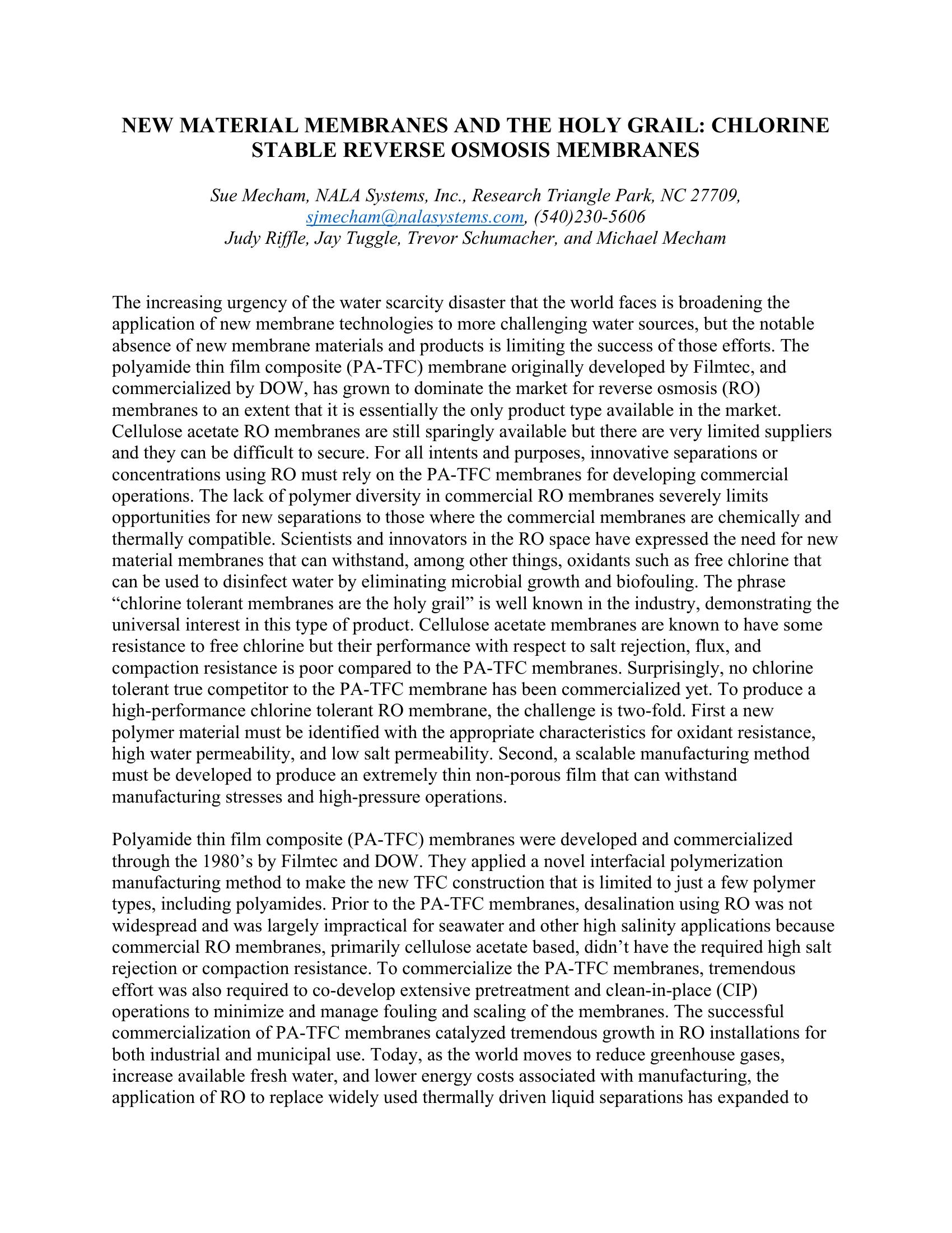 New Material Membranes and the Holy Grail: Chlorine Stable Reverse Osmosis Membranes