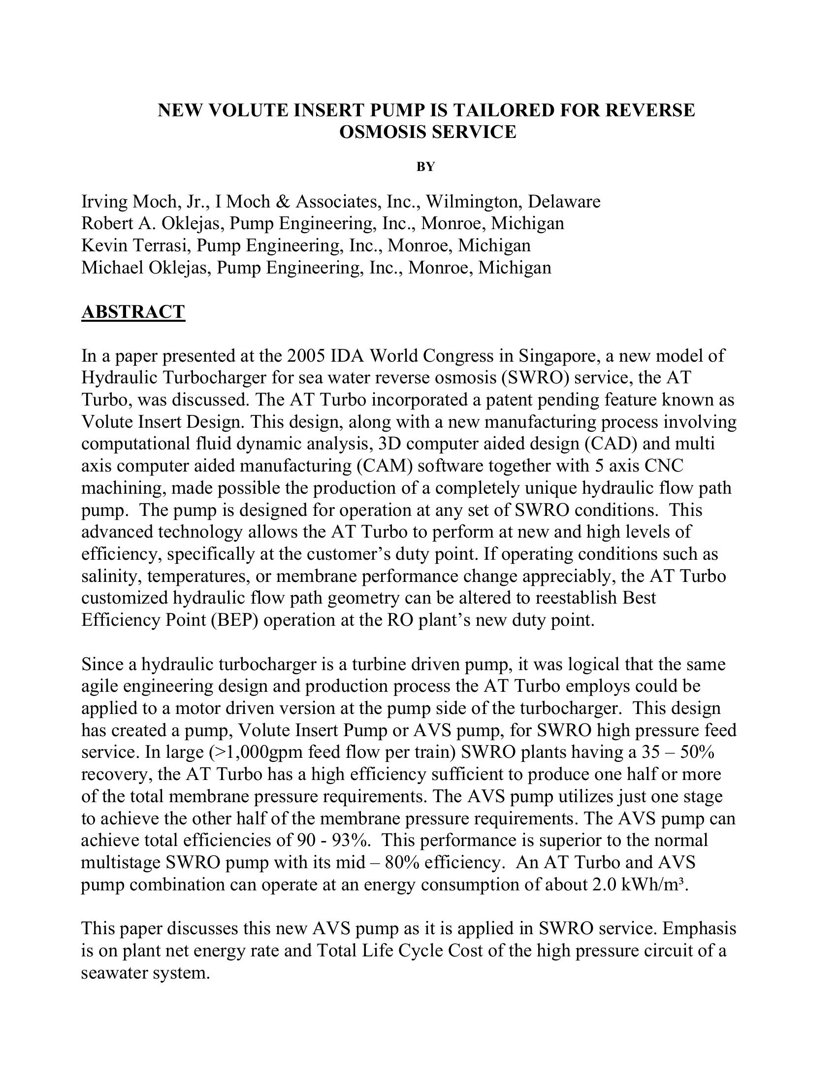 Discussion of Volume Insert Pumps for seawater desalination service. Combination of devices to improve efficiencies and reduce energy consumption.
