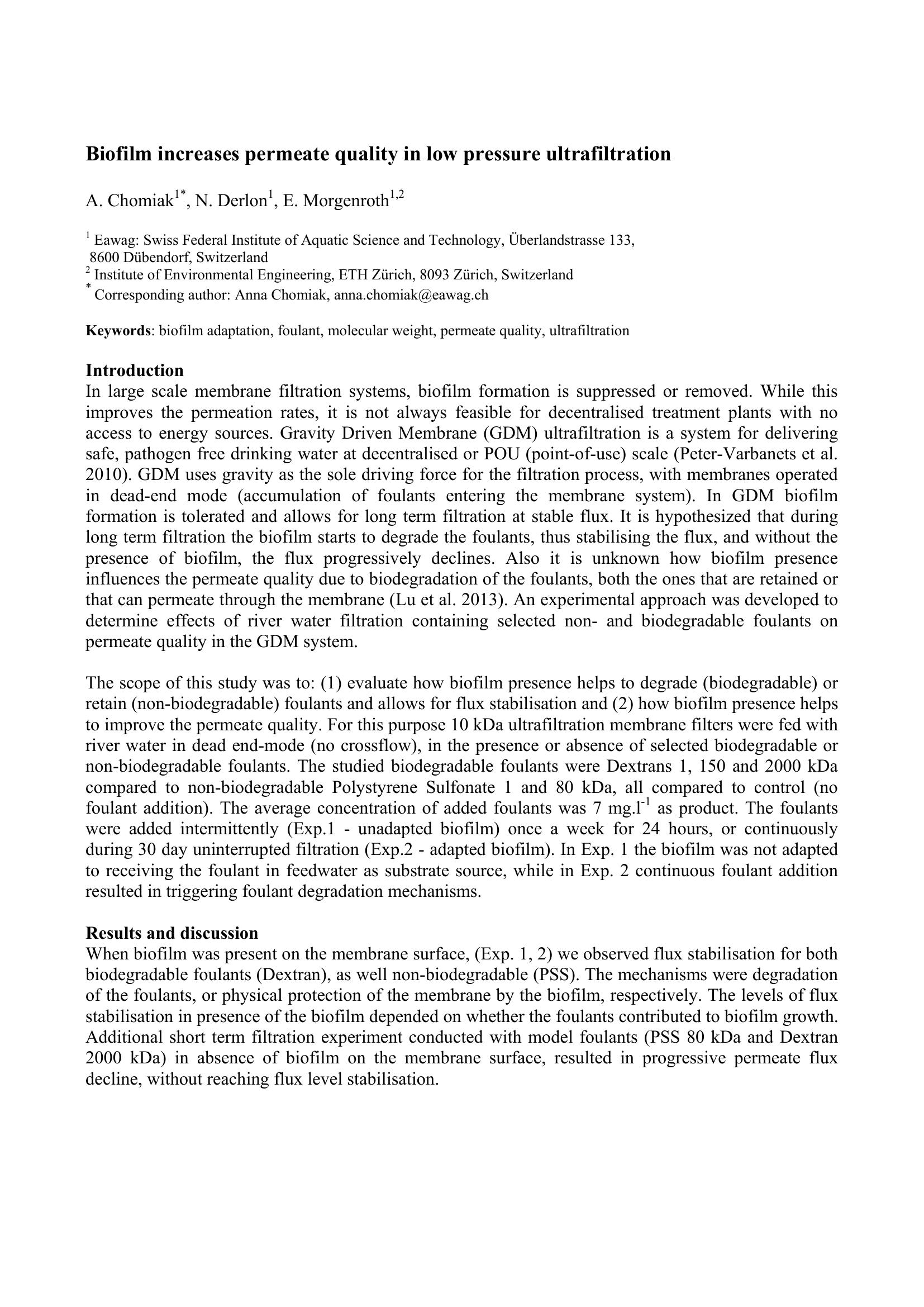 | Keywords | Fouling, Concentration, Polarization, biofilms, UF, gravity driven |