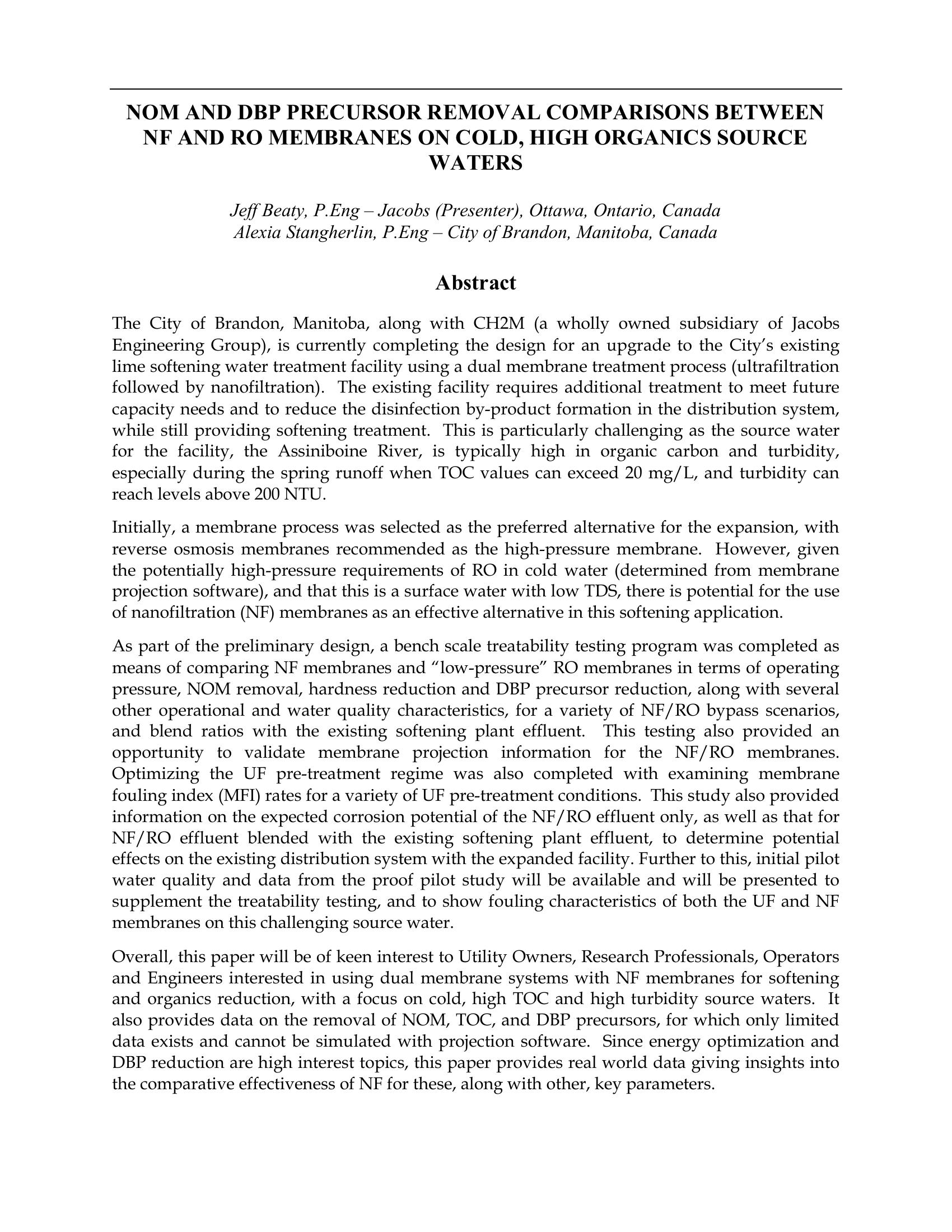 The City of Brandon, Manitoba, along with CH2M (a wholly owned subsidiary of Jacobs Engineering Group), is currently completing the design for an upgrade to the Cityís existing lime softening water treatment facility using a dual membrane treatment process (ultrafiltration followed by nanofiltration). The existing facility requires additional treatment to meet future capacity needs and to reduce the disinfection by-product formation in the distribution system, while still providing softening treatment. This is particularly challenging as the source water for the facility, the Assiniboine River, is typically high in organic carbon and turbidity, especially during the spring runoff when TOC values can exceed 20 mg/L, and turbidity can reach levels above 200 NTU. Initially, a membrane process was selected as the preferred alternative for the expansion, with reverse osmosis membranes recommended as the high-pressure membrane. However, given the potentially high-pressure requirements of RO in cold water (determined from membrane projection software), and that this is a surface water with low TDS, there is potential for the use of nanofiltration (NF) membranes as an effective alternative in this softening application. As part of the preliminary design, a bench scale treatability testing program was completed as means of comparing NF membranes and ìlow-pressureî RO membranes in terms of operating pressure, NOM removal, hardness reduction and DBP precursor reduction, along with several other operational and water quality characteristics, for a variety of NF/RO bypass scenarios, and blend ratios with the existing softening plant effluent. This testing also provided an opportunity to validate membrane projection information for the NF/RO membranes. Optimizing the UF pre-treatment regime was also completed with examining membrane fouling index (MFI) rates for a variety of UF pre-treatment conditions. This study also provided information on the expected corrosion potential of the NF/RO effluent only, as well as that for NF/RO effluent blended with the existing softening plant effluent, to determine potential effects on the existing distribution system with the expanded facility. Further to this, initial pilot water quality and data from the proof pilot study will be available and will be presented to supplement the treatability testing, and to show fouling characteristics of both the UF and NF membranes on this challenging source water. Overall, this paper will be of keen interest to Utility Owners, Research Professionals, Operators and Engineers interested in using dual membrane systems with NF membranes for softening and organics reduction, with a focus on cold, high TOC and high turbidity source waters. It also provides data on the removal of NOM, TOC, and DBP precursors, for which only limited data exists and cannot be simulated with projection software. Since energy optimization and DBP reduction are high interest topics, this paper provides real world data giving insights into the comparative effectiveness of NF for these, along with other, key parameters.