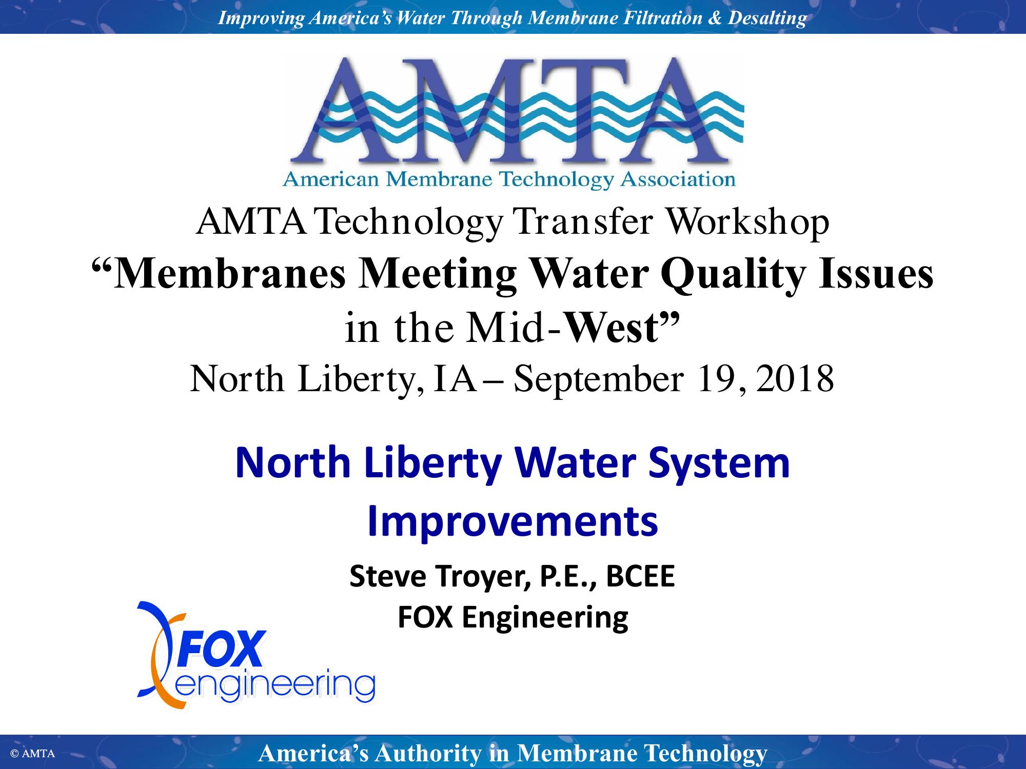 The presentation will cover the North Liberty water system and the commities need for expanding the treatment capacity and improving the water quality. It will include the pilot study that was completed in 2014 through the planning, design, construction, and start-up of the city’s new 3.0 MGD nanofiltration treatment plant.