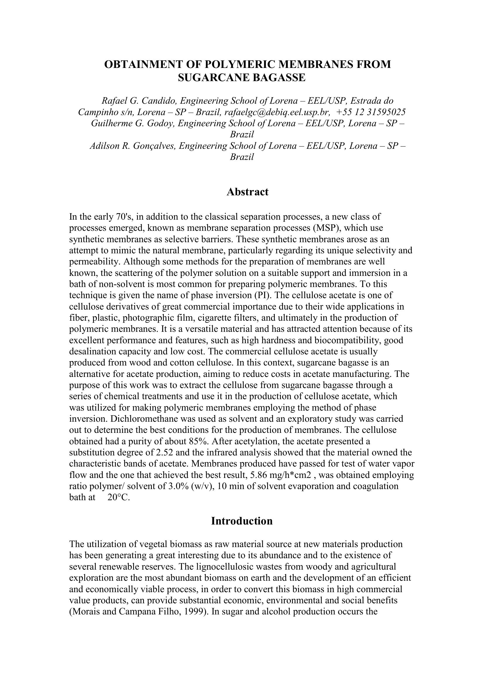 Obtainment of Polymeric Membranes from Sugarcane Bagasse