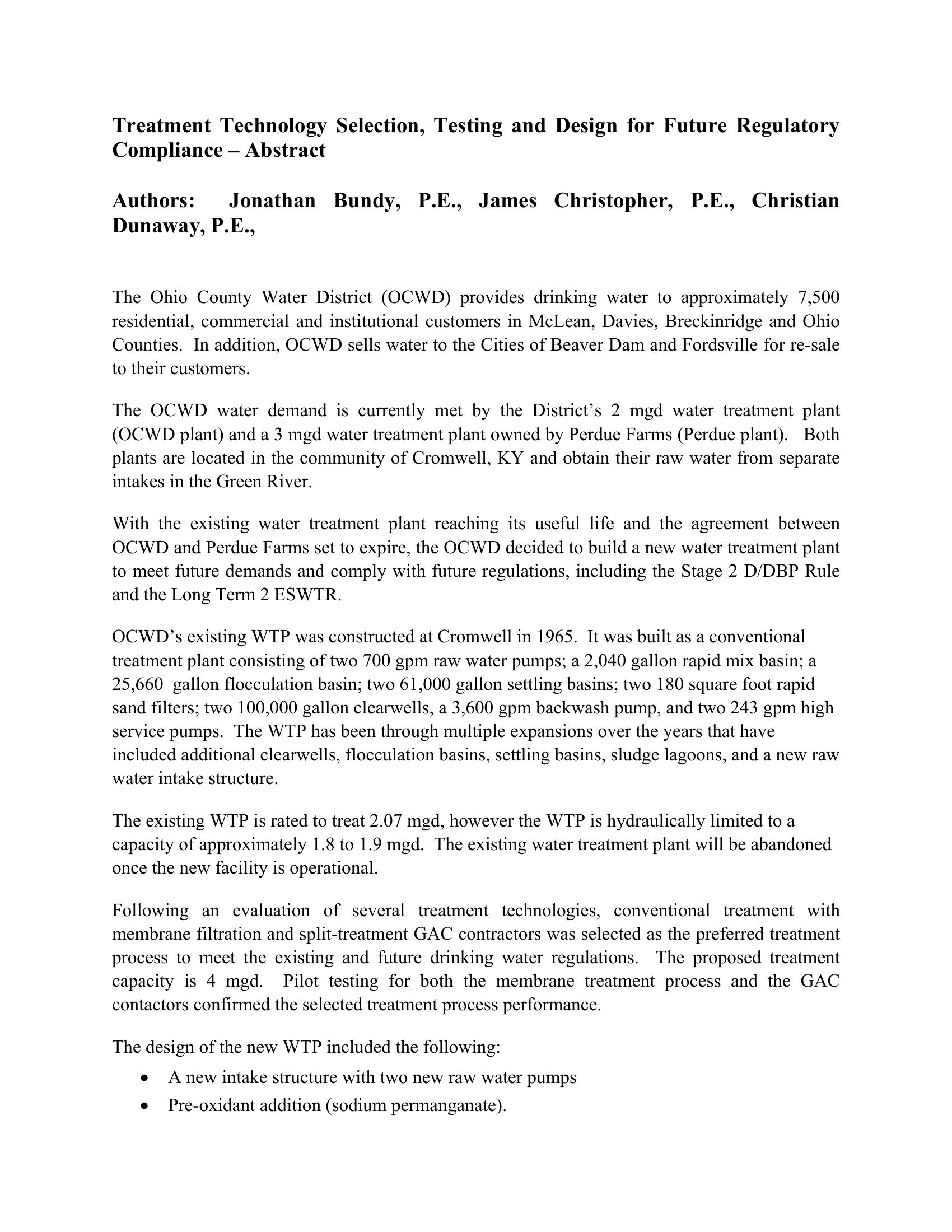 This paper descirbes the The Ohio County Water District (OCWD) Treatment Technology selection, testing and design for future regulatory compliance. The design of the new WTP has been a successful implementation of water treatment facilities that included implementation of existing treatment processes in combination with newmembrane treatment technologies to meet changing regulatory requirements.