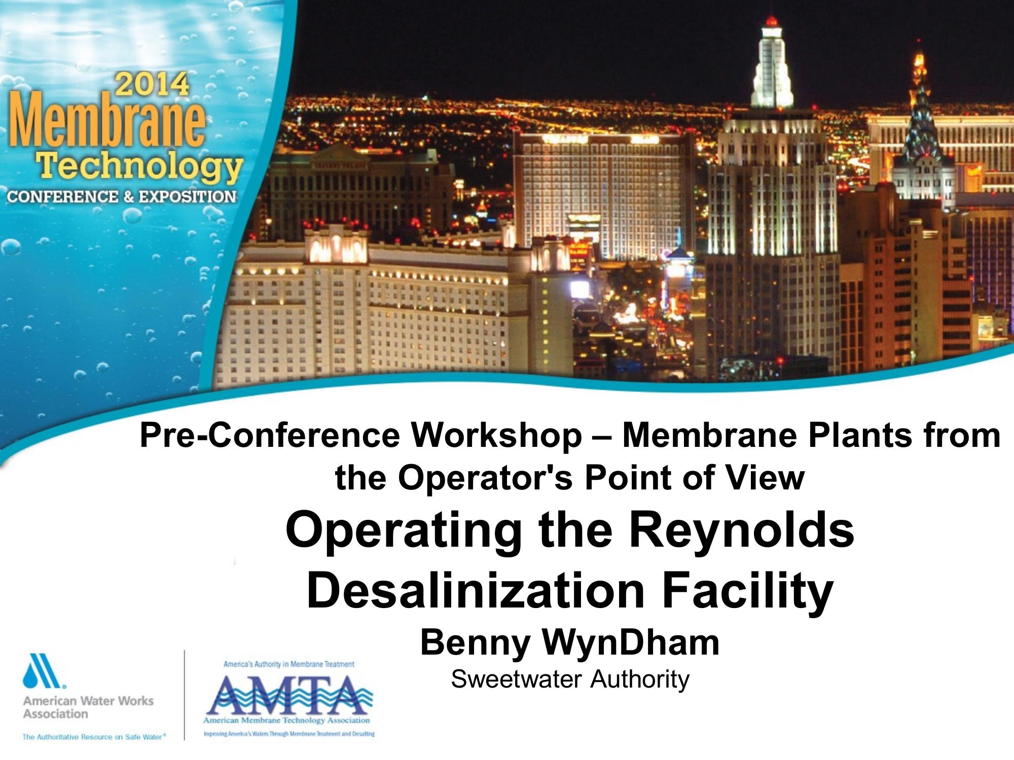 This presentation reviewing the operations of the Sweetwater Authority’s Reynolds membrane plant was given at a Preconference Workshop in 2014 that discussed membrane plants from an operators point of view. It shows most of the plant operations and gives some background on the membrane facility