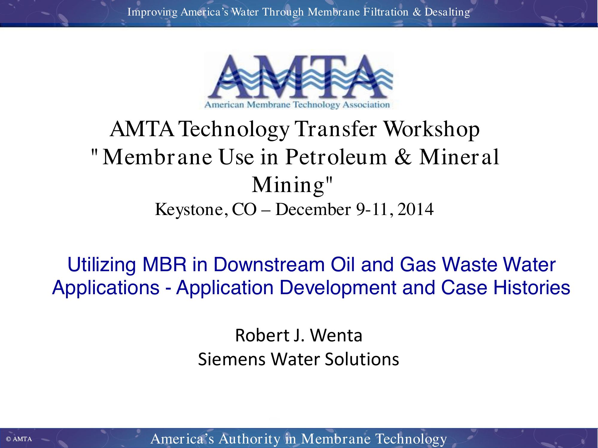 Discusses use of membrane bioreactors for oil and gas, issues with oil fouling, pretreatment, and cleaning requirements. Includes case studies on pilot test and full scale implementation.