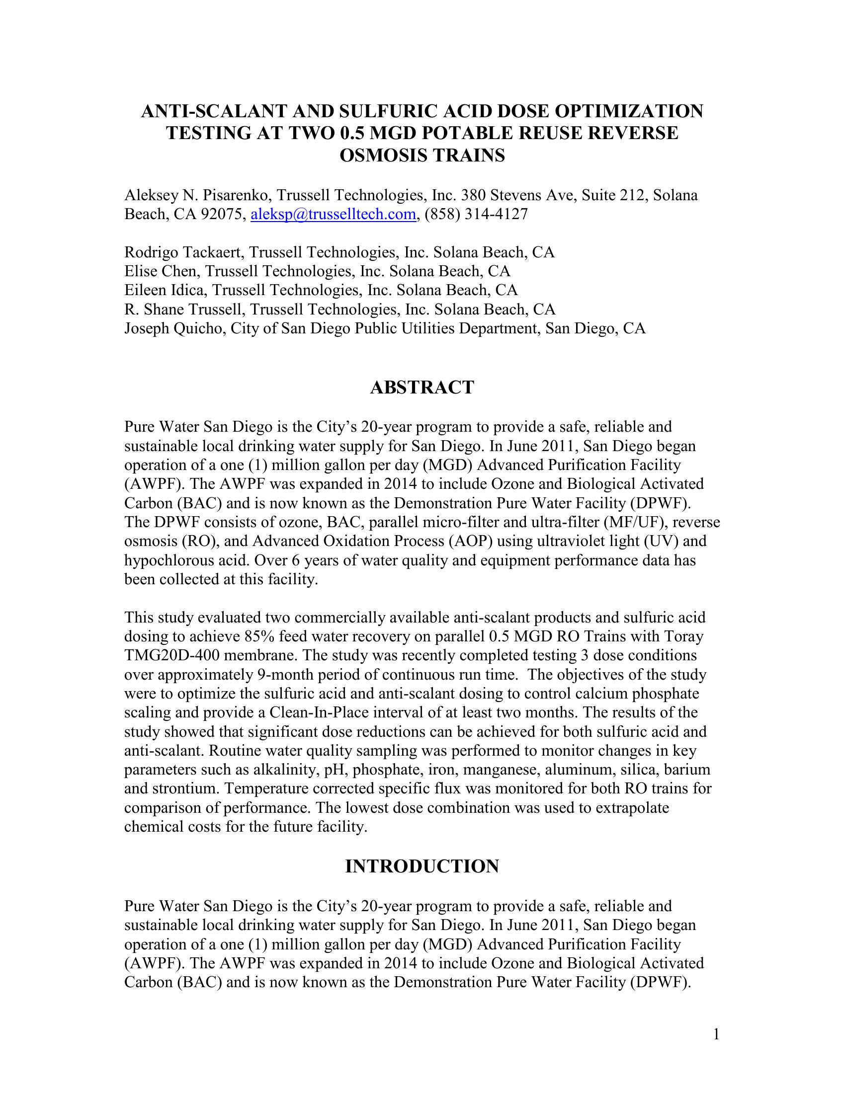 The current study summarizes findings of over 9-month long optimization study evaluating different chemical dosing strategies to address common scalants, such as calcium phosphate, on reverse osmosis membrane systems used in municipal wastewater treatment for potable reuse. The type of project testing different dose strategies in this case at demonstration scale (1 MGD facility) provides plant operators and supervisors with information to be used for full-scale facility operation and maintenance. As such this talk, will share knowledge from a case-study type project using actual process water and operating with the same size and type of RO membrane expected at full-scale and should be most useful for reuse facilities.