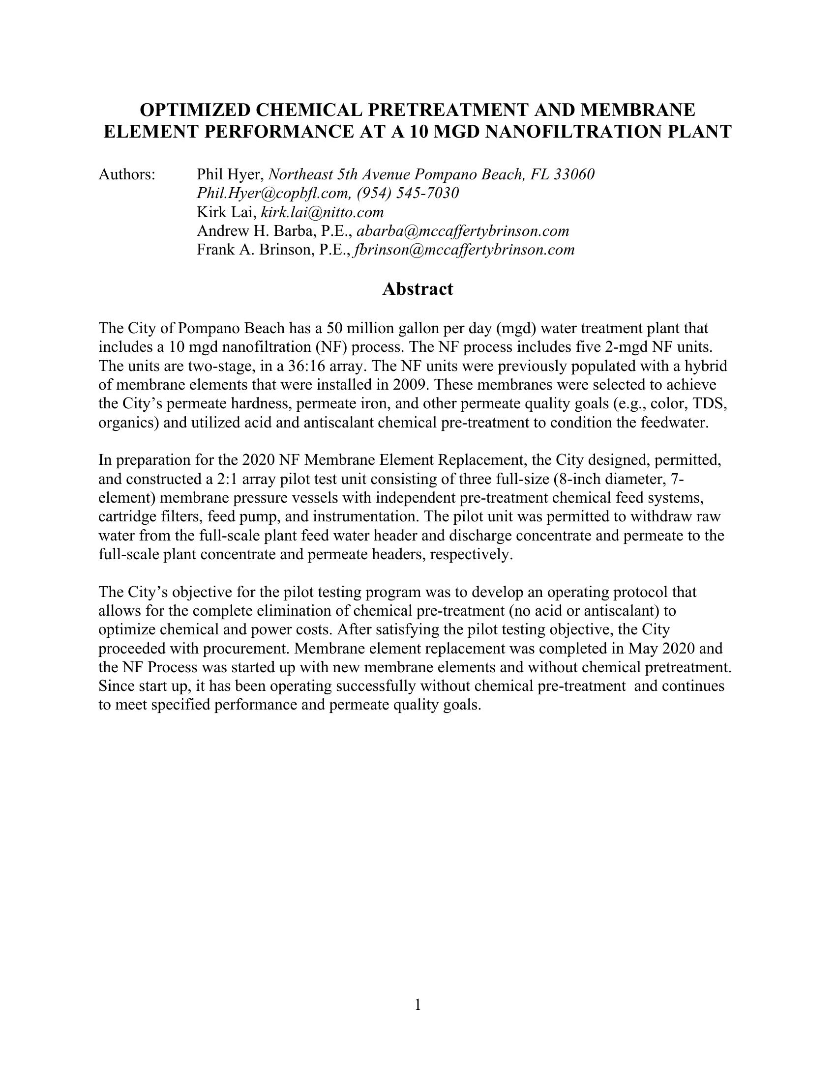The City of Pompano Beach has a 50 million gallon per day (mgd) water treatment plant that includes a 10 mgd nanofiltration (NF) process. The NF process includes five 2-mgd NF units. The units are two-stage, in a 36:16 array. The NF units were previously populated with hybrid of membrane elements that were installed in 2009. These membranes were selected to achieve the Cityís permeate hardness, permeate iron, and other permeate quality goals (e.g., color, TDS, organics) and utilized acid and antiscalant chemical pre-treatment to condition the feedwater. In preparation for the 2020 NF Membrane Element Replacement, the City designed, permitted, and constructed a 2:1 array pilot test unit consisting of three full-size (8-inch diameter, 7-element) membrane pressure vessels with independent pre treatment chemical feed systems, cartridge filters, feed pump, and instrumentation. The pilot unit was permitted to withdraw rawwater from the full-scale plant feed water header and discharge concentrate and permeate to the full-scale plant concentrate and permeate headers, respectively.