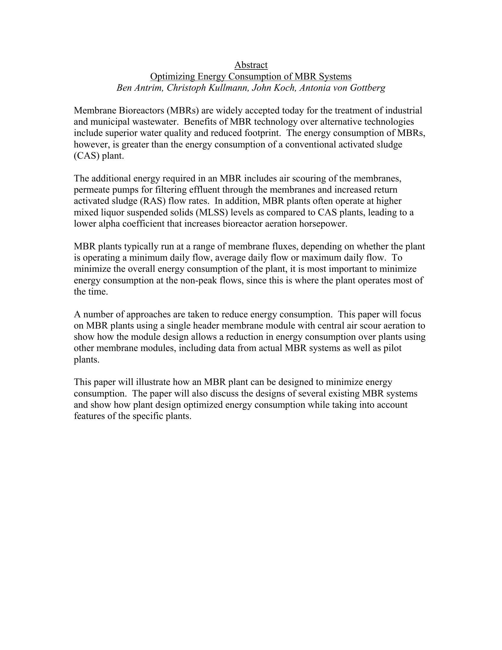 Membrane Bioreactors (MBRs) are widely accepted today for the treatment of industrial and municipal wastewater. Benefits of MBR technology over alternative technologies include superior water quality and reduced footprint. The energy consumption of MBRs however, is greater than the energy consumption of a conventional activated sludge (CAS) plant. Energy optimization is a challenge when implementing membranes with a widely varying flow pattern and significant changes in the annual water temperature. Both peak flow events and water temperature play a critical role in determining the required membrane area. This paper focuses on MBR plants using a single header membrane module with central air scour aeration to show how the module design allows a reduction in energy consumption. In addition to the membrane module design, this paper will also identify areas concerning the overall plant design and unique operating concepts that maximize membrane performance while minimizing energy consumption. This paper uses one example of a membrane module to describe how energy onsumption of a plant can be minimized. The example module is a single header submerged hollow fiber UF module, designated the PURON? module. Features of both module construction as well as overall plant design and operation will reduce the average energy demand of optimized plants to the range of 0.6 kWh/m? or lower. Continued membrane product development, focused on optimizing energy consumption, will further develop the membrane market for municipal wastewater treatment, providing high quality water at a low cost.