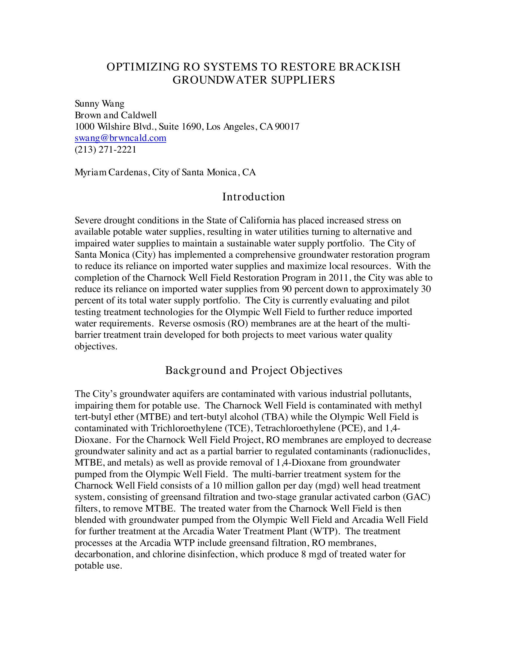 This paper describes efforts by the City of Santa Monica (City) for groundwater restoration program to reduce its reliance on imported water supplies and maximize local resources. With the completion of the Charnock Well Field Restoration Program in 2011, the City was able to reduce its reliance on imported water supplies from 90% down to approximately 30% of its total water supply portfolio. The City is pilot testing treatment technologies for the Olympic Well Field to further reduce imported water requirements. Reverse osmosis (RO) membranes are at the heart of the multibarrier treatment train developed for both projects to meet various water quality objectives.