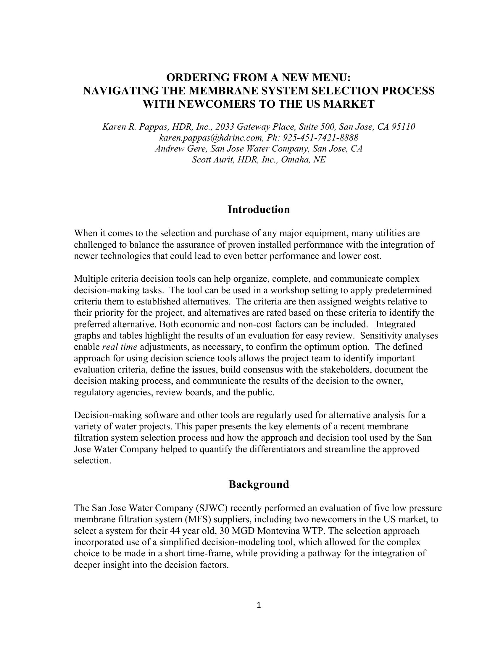 Selection process of 5 low pressure membrane filtration system suppliers incorporating a decision modeling tool.