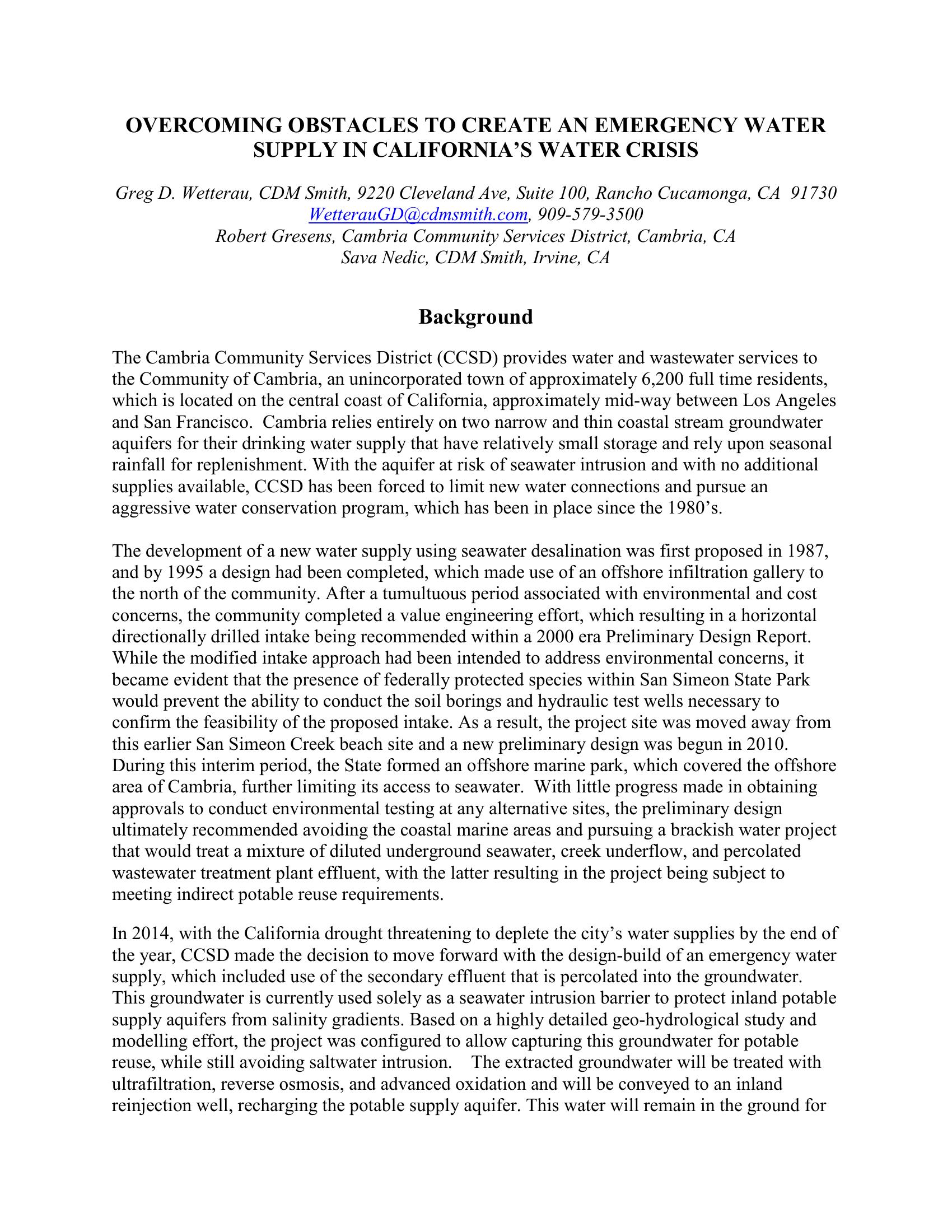 | Keywords | Indirect Potable Reuse, Evaporation of RO Concentrate for Disposal, Cambria Community Service District |