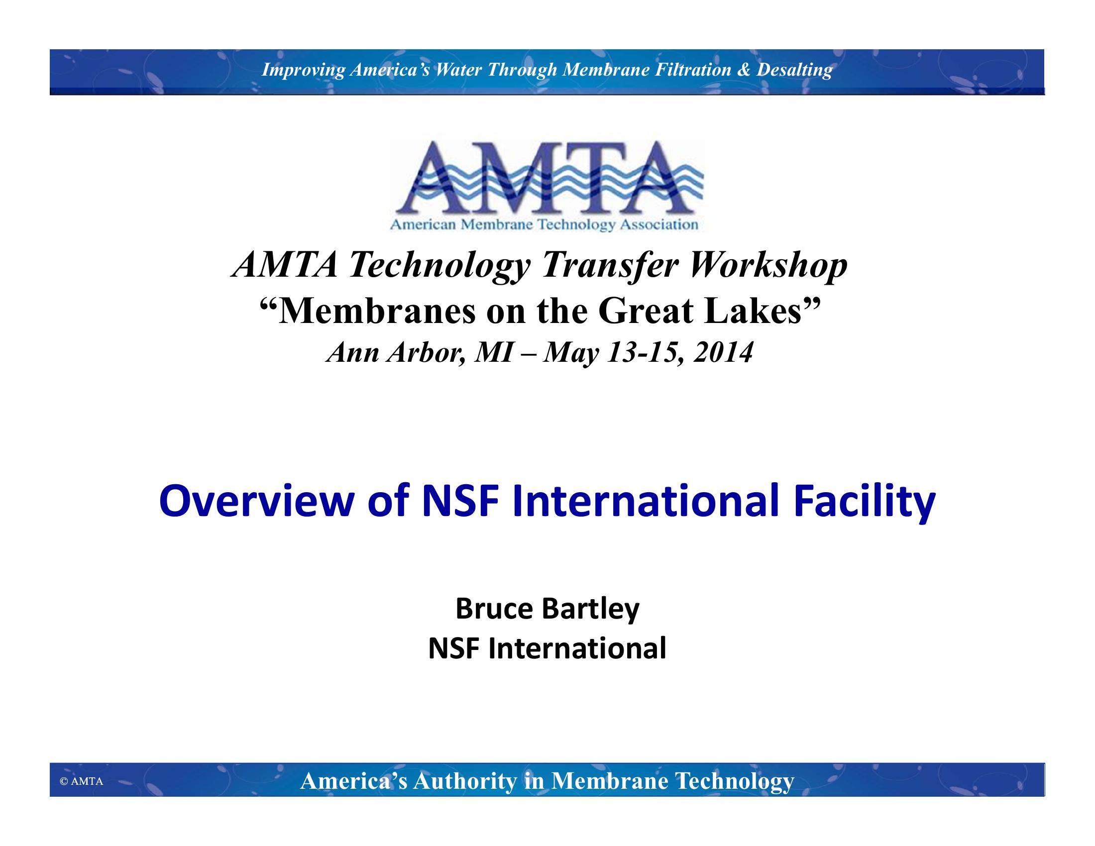 This presentation discusses the mission, history, and capabilities of NSF International. The presentation incudes a listing of accreditations, certifications, and focus areas. A list of water and wastewater standards is also provided.