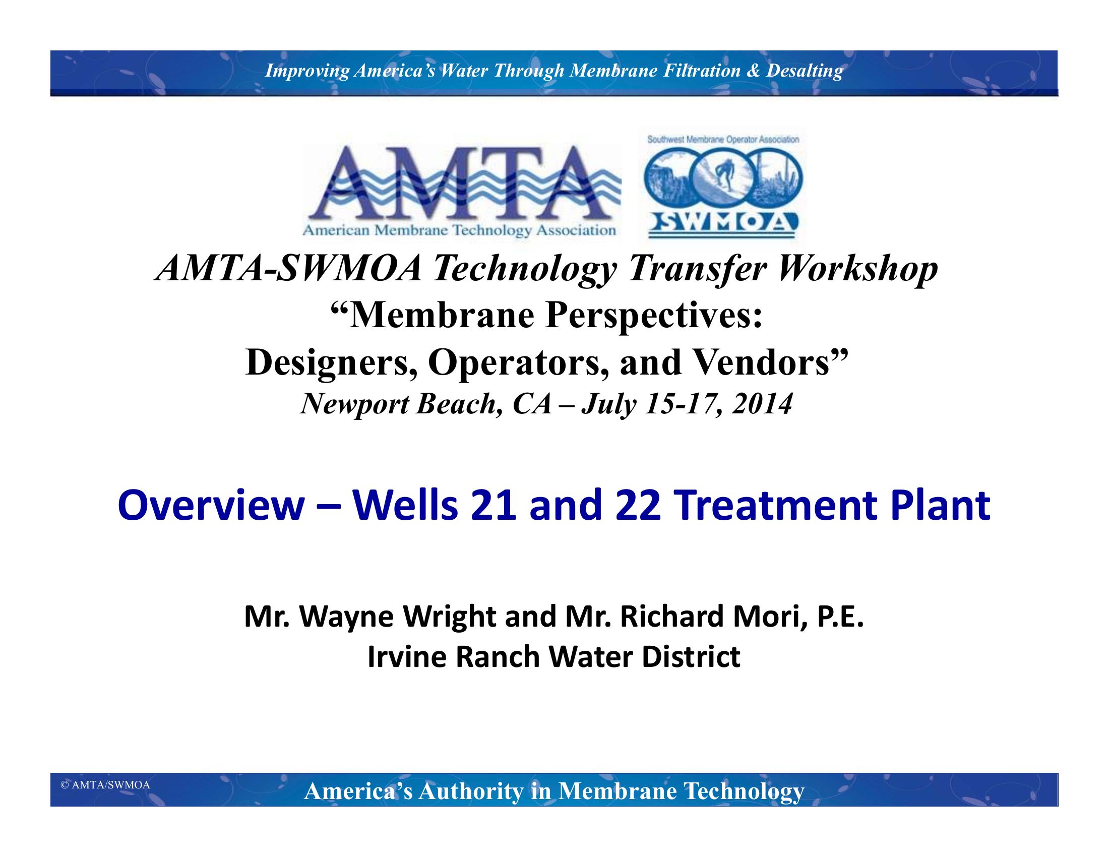 This presentation discusses the planning, design, and construction of the Wells 21 and 22 Treatment Plant for the Irvine Ranch Water District. The presentation begins with an overview of the project and treatment goals. Next the pretreatment, two-stage reverse osmosis (RO), and post-treatment processes are presented along with select design criteria. The presentation concludes with a discussion on operating considerations and lessons learned.