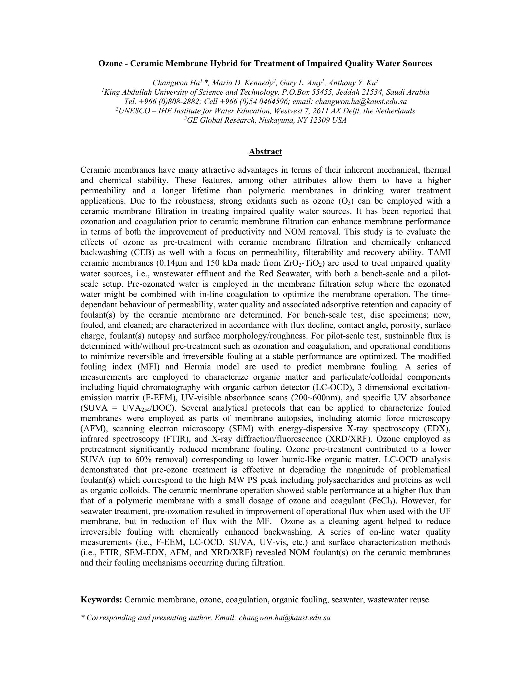 | Keywords | Ceramic membrane, ozone, coagulation, organic fouling, seawater, wastewater reuse |