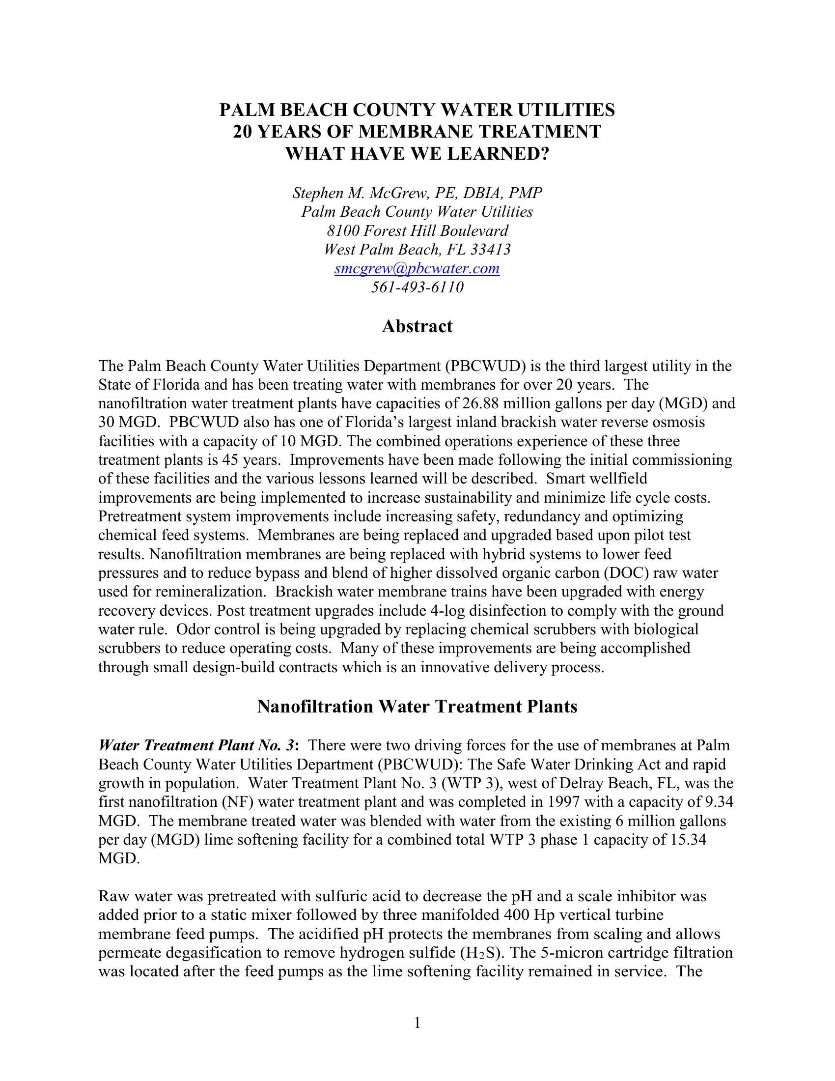 Palm Beach County Water Utilities 20 Years of Membrane Treatment What Have We Learned?