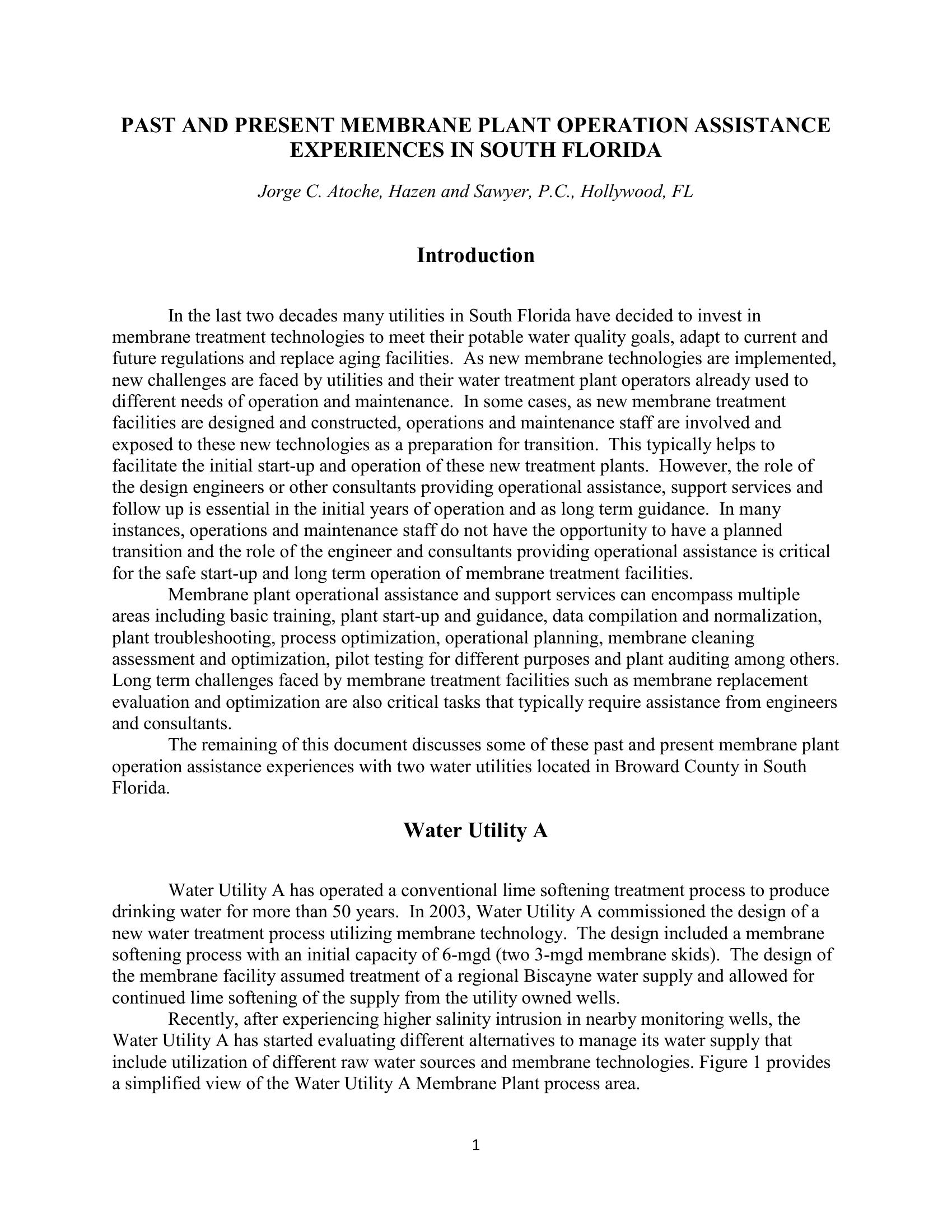 This paper and presentation discuss past and present experiences with membrane plant operational assistance, including plant start-up and guidance, data normalization and evaluation, troubleshooting, process optimization, membrane cleaning assessment and optimization, membrane replacement, pilot testing, and energy savings optimization, among others.