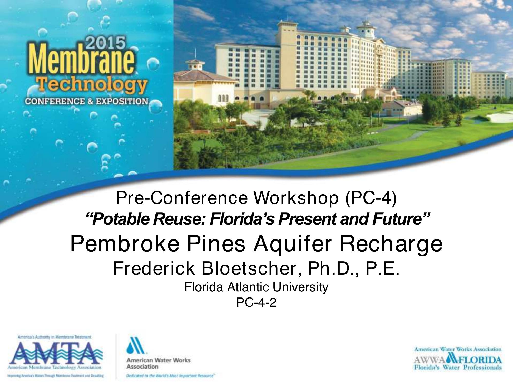 Presentation on the Pembroke Pines Aquifer Recharge project and its goals of qualifying alternative water supplies and applying the best available technology to meet stringent local requirements for ground water discharge. The City initiated an RO pilot study with several goals including characterizing the water quality, selecting the optimal RO membrane, and determining the success of RO in eliminating emerging substances of concern.