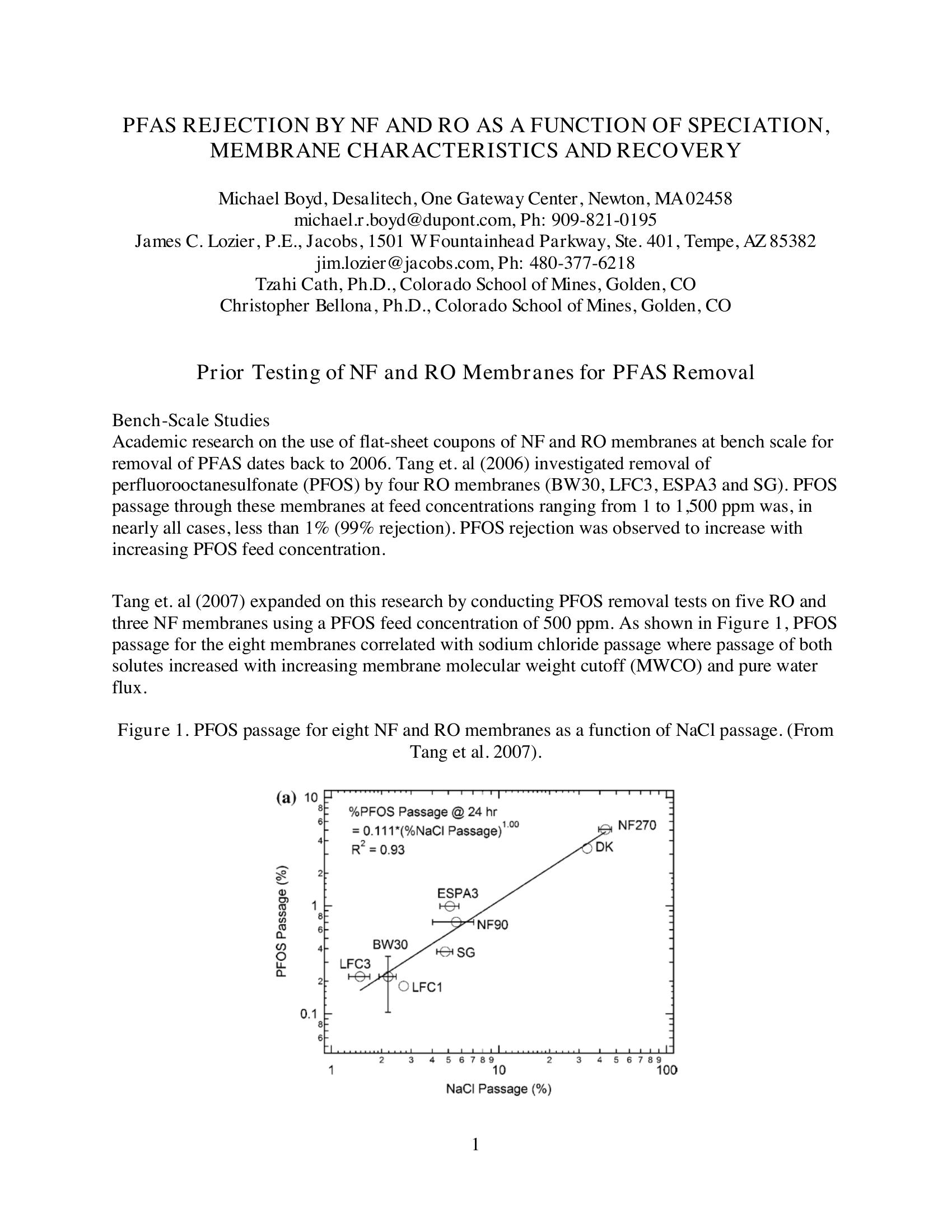Academic research on the use of flat-sheet coupons of NF and RO membranes at bench scale for removal of PFAS dates back to 2006. Tang et. al (2006) investigated removal of perfluorooctanesulfonate (PFOS) by four RO membranes (BW30, LFC3, ESPA3 and SG). PFOS passage through these membranes at feed concentrations ranging from 1 to 1,500 ppm was, in nearly all cases, less than 1% (99% rejection). PFOS rejection was observed to increase with increasing PFOS feed concentration.