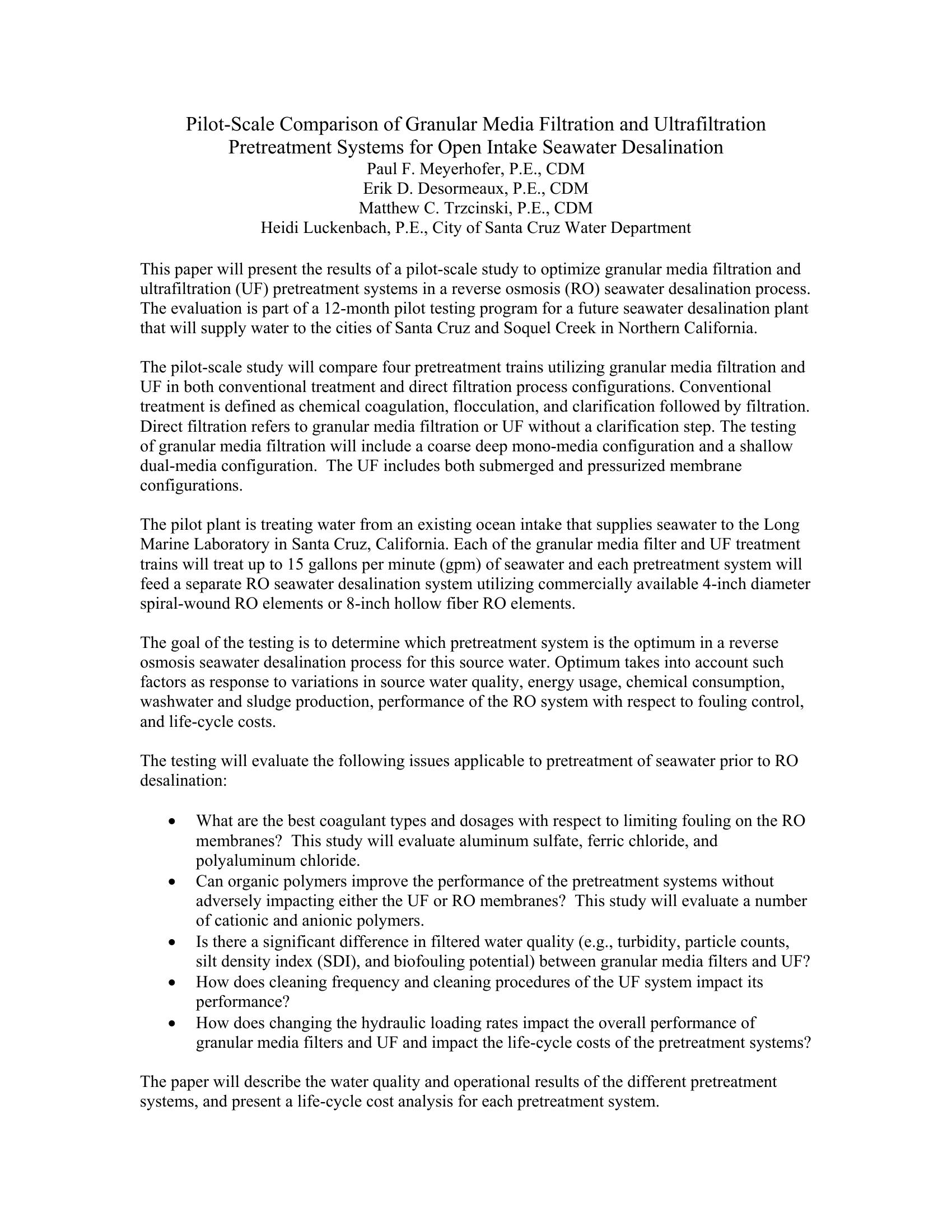 Pilot-Scale Comparison of Granular Media Filtration & UF Pretreatment Systems for Open Intake Seawater Desal