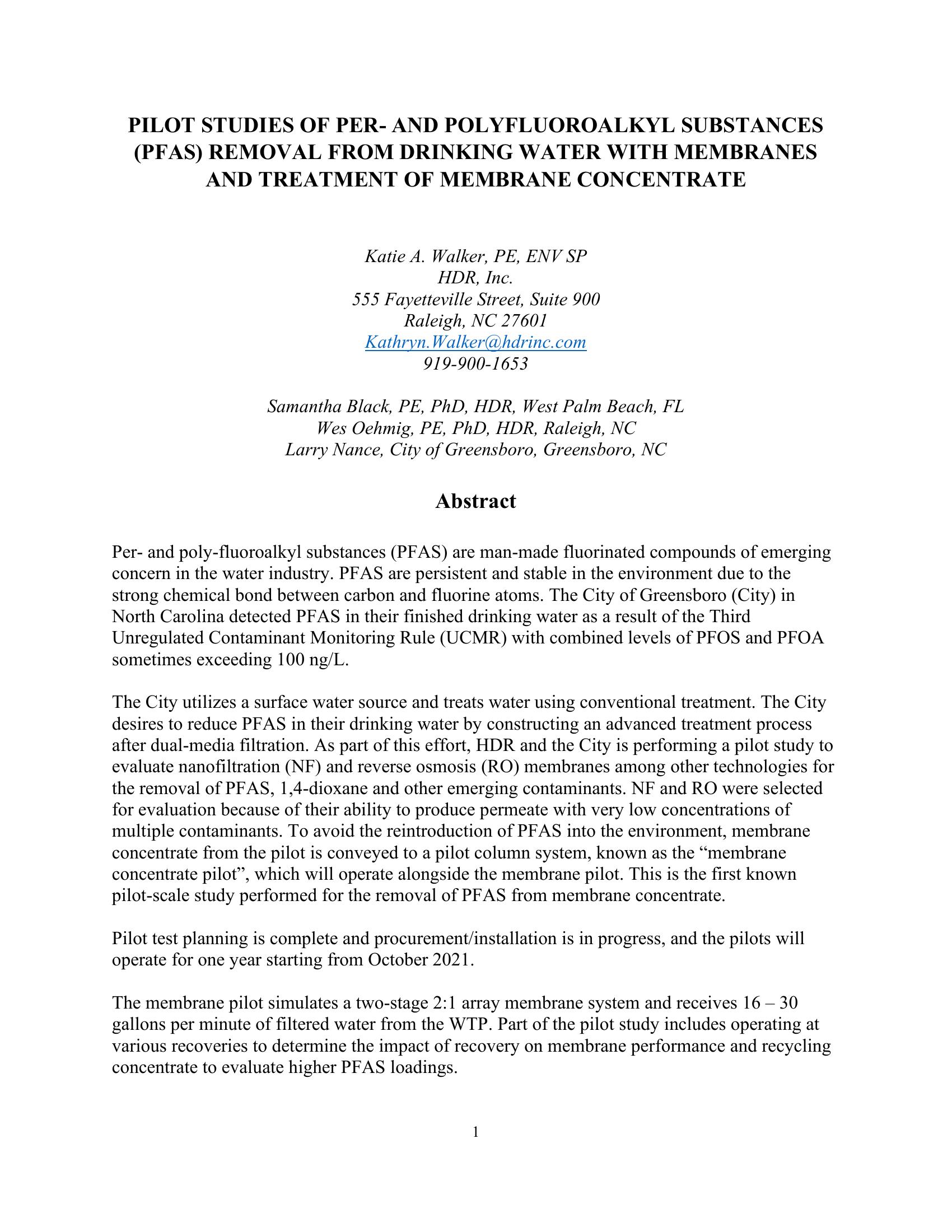 Per- and poly-fluoroalkyl substances (PFAS) are man-made fluorinated compounds of emerging concern in the water industry. PFAS are persistent and stable in the environment due to the strong chemical bond between carbon and fluorine atoms. The City of Greensboro (City) in North Carolina detected PFAS in their finished drinking water as a result of the Third Unregulated Contaminant Monitoring Rule (UCMR) with combined levels of PFOS and PFOA sometimes exceeding 100 ng/L. The City utilizes a surface water source and treats water using conventional treatment. The City desires to reduce PFAS in their drinking water by constructing an advanced treatment process after dual-media filtration. As part of this effort, HDR and the City is performing a pilot study to evaluate nanofiltration (NF) and reverse osmosis (RO) membranes among other technologies for the removal of PFAS, 1,4-dioxane and other emerging contaminants. NF and RO were selected for evaluation because of their ability to produce permeate with very low concentrations of multiple contaminants. To avoid the reintroduction of PFAS into the environment, membrane concentrate from the pilot is conveyed to a pilot column system, known as the ìmembrane concentrate pilotî, which will operate alongside the membrane pilot. This is the first known pilot-scale study performed for the removal of PFAS from membrane concentrate. Pilot test planning is complete and procurement/installation is in progress, and the pilots will operate for one year starting from October 2021. The membrane pilot simulates a two-stage 2:1 array membrane system and receives 16 ñ 30 gallons per minute of filtered water from the WTP. Part of the pilot study includes operating at various recoveries to determine the impact of recovery on membrane performance and recycling concentrate to evaluate higher PFAS loadings.