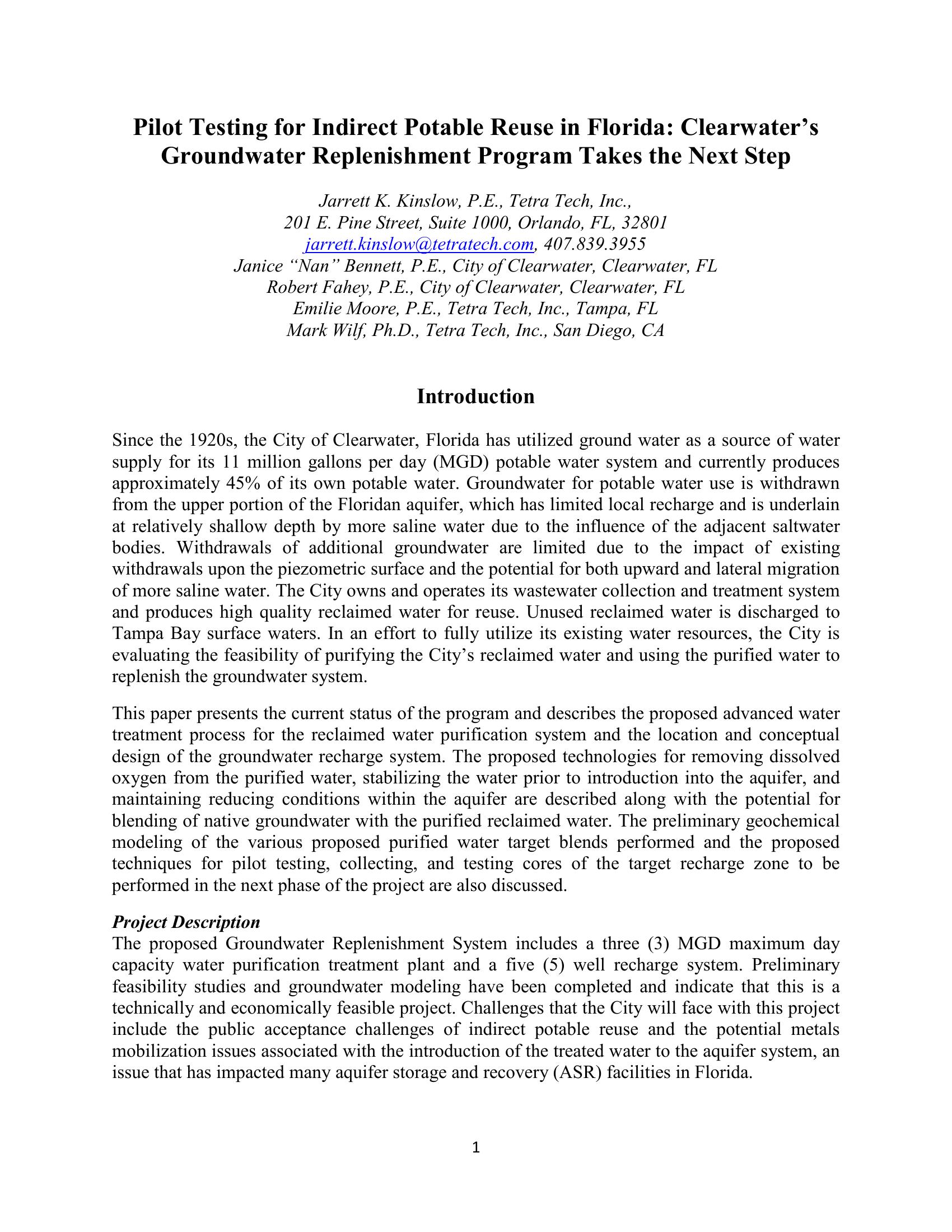 KeywordsPilot Testing, Indirect Potable Reuse, Groundwater, MF, ASR, Floridian, oxidation